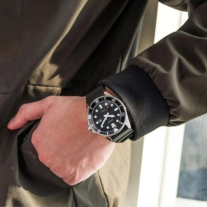En este reloj deportivo, se agrega un marco giratorio unidireccional al diseño clásico de manecillas de hora, minutos y segundos. La correa de uretano está hecha de resina de base biológica producida a partir de materiales orgánicos renovables.
