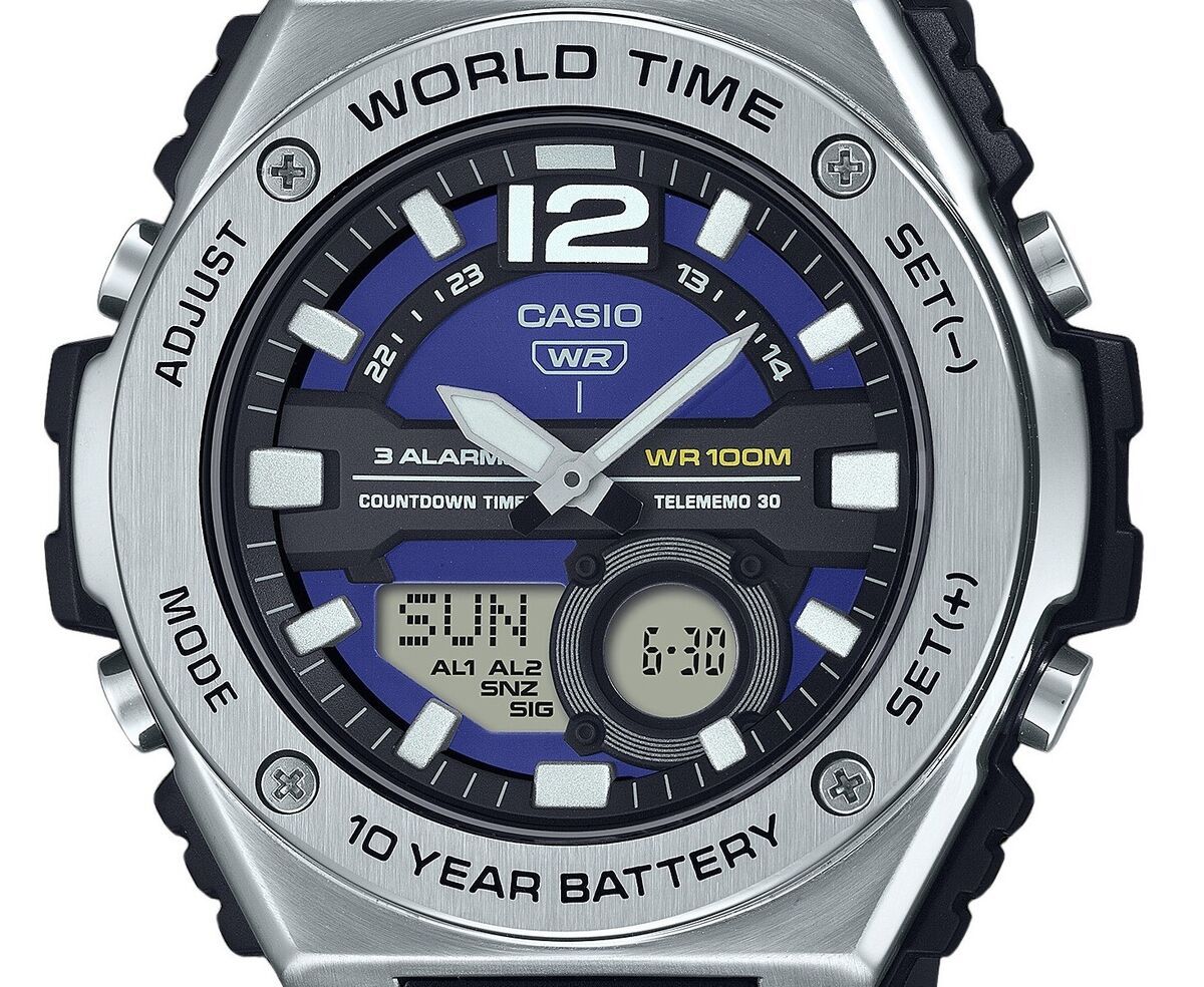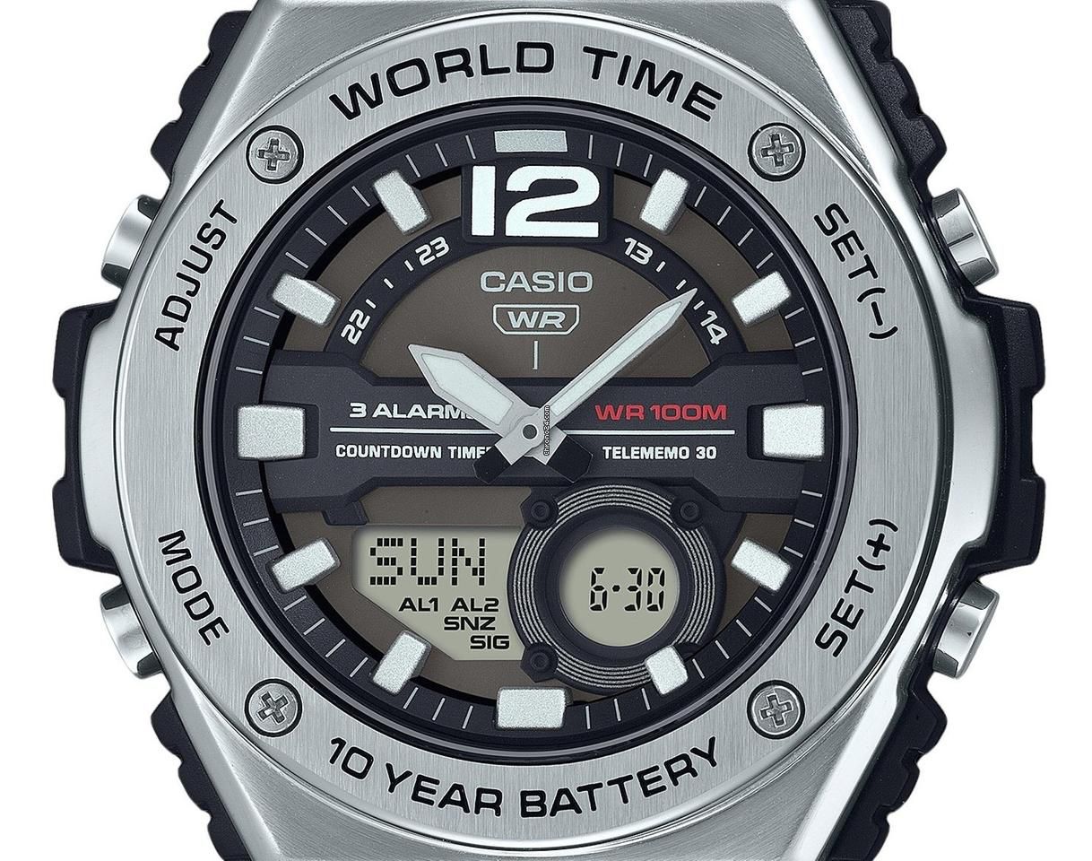 MWQ-100 Casio Hora mundial, Telememo, 10 Años de Batería Reloj para Hombre Pulsera de Caucho Doble hora