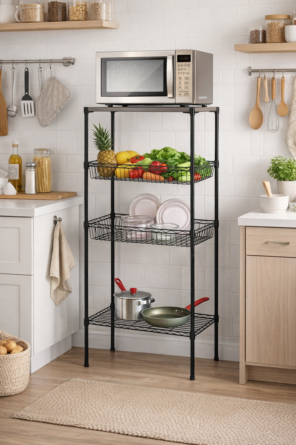 - Artículo: Estante metálico de alambre de 4 niveles, ahorrador de espacio y multipropósito, con estante de almacenamiento y tablero de madera en la parte superior
