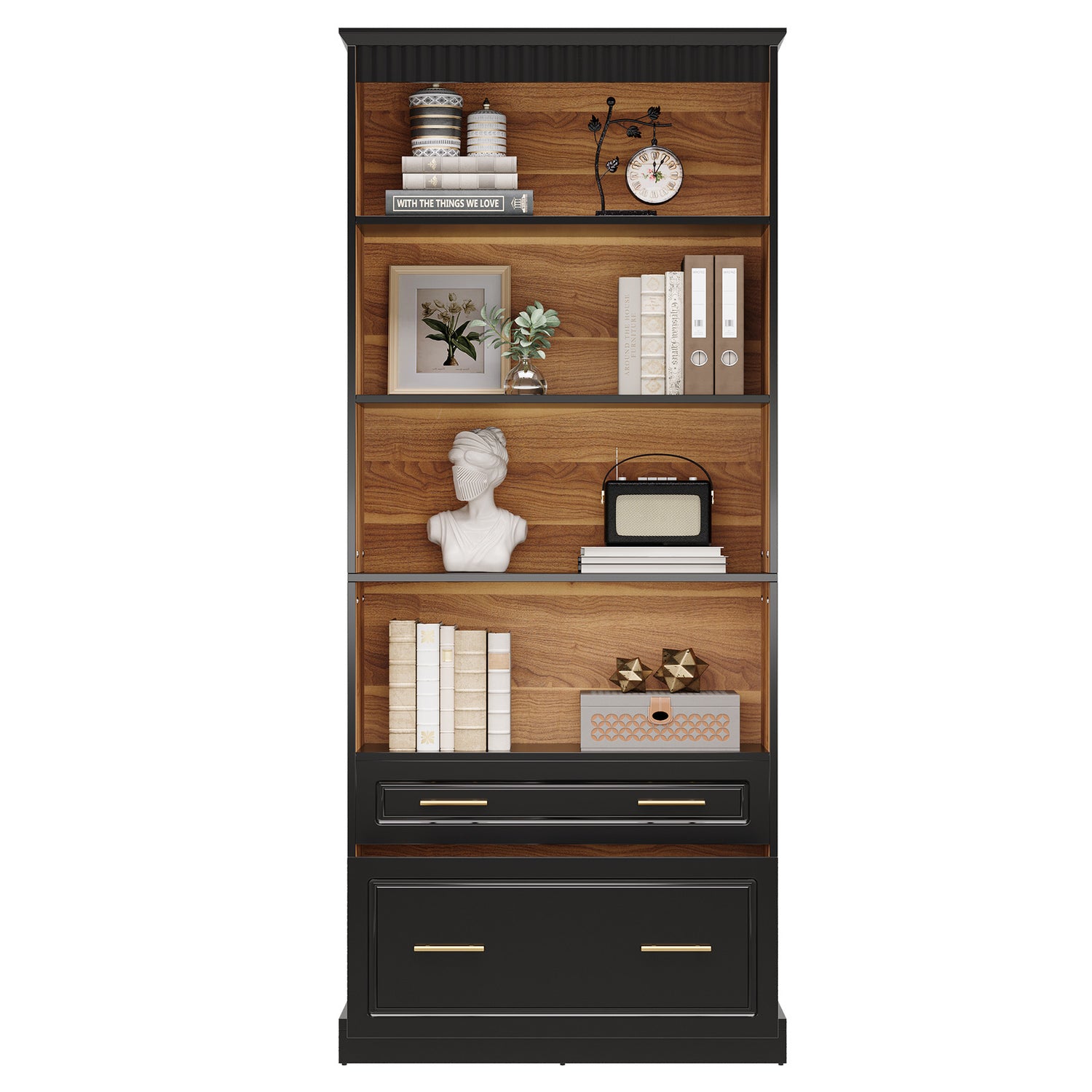 Este elegante librero TRIBESIGNS combina diseño moderno e industrial con funcionalidad práctica. Su estructura en acabado negro con interior en tono madera natural crea un contraste sofisticado, ideal para oficina, estudio o sala.