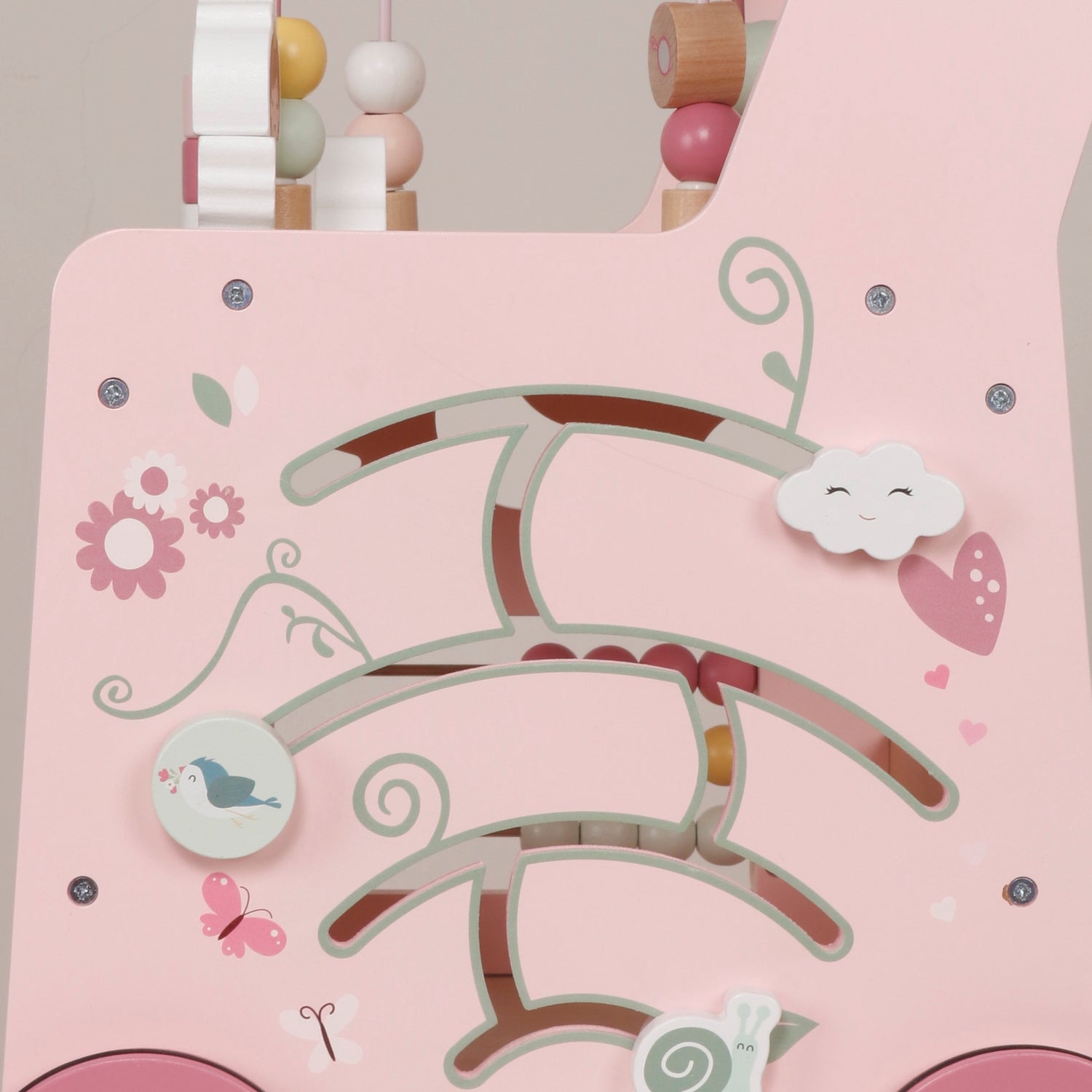 - Panel frontal con juegos de manipulación (engranajes, formas).