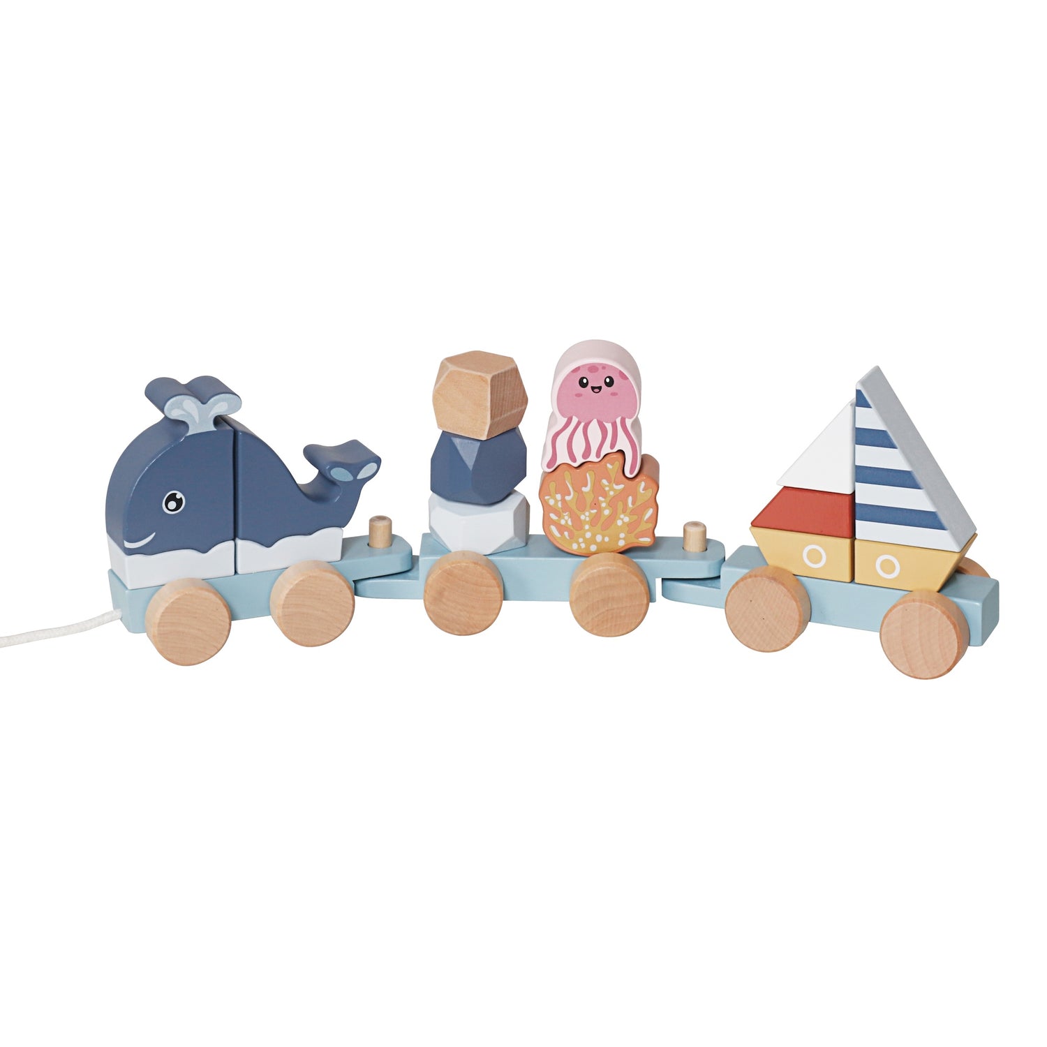¡A bordo para una aventura marina! Este tren de arrastre combina la diversión del movimiento con el aprendizaje de la fauna marina. Las piezas son apilables, lo que añade un reto de motricidad fina a la aventura.