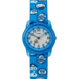 - Descripción: Reloj juvenil con caja de resina azul translúcida de 28 mm, correa de tela elástica azul con diseño de monstruos y esfera blanca con marcadores arábigos completos.