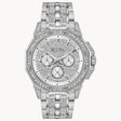 Reloj Bulova para hombre de la colección Octava, diseñado con un estilo llamativo y lujoso gracias a sus 300 cristales aplicados en caja, brazalete y carátula. Su configuración multifunción de seis manecillas y su diseño plateado lo convierten en una pieza elegante y audaz.