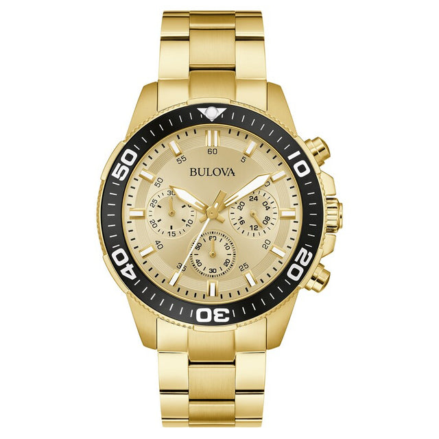 El Bulova 98A315 es un cronógrafo de estética deportiva y totalmente dorada, con carátula color champagne, bisel giratorio y manecillas luminiscentes. Su diseño robusto y elegante lo convierte en una pieza versátil para uso diario o vestir.