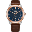 - Descripción: Reloj elegante de diseño vintage para caballero con caja de acero inoxidable de 40 mm, correa de piel café y esfera azul marino con indicadores en oro rosa. Incluye tecnología Eco-Drive y funciones de día y fecha.