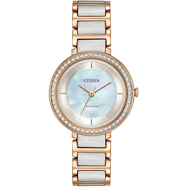 Un reloj elegante y sofisticado para dama, con una combinación de acero inoxidable en dos tonos y detalles en cristal Swarovski. Su carátula de nácar blanco y su cristal esférico lo convierten en una pieza femenina y lujosa. Equipado con tecnología Eco-Drive, funciona con cualquier fuente de luz y nunca necesita cambio de batería.