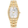Reloj Citizen Eco-Drive para dama con un diseño elegante en acabado dorado, carátula plateada y cristal mineral esférico elevado. Funciona con energía de luz para un uso continuo y sostenible sin reemplazo de baterías.