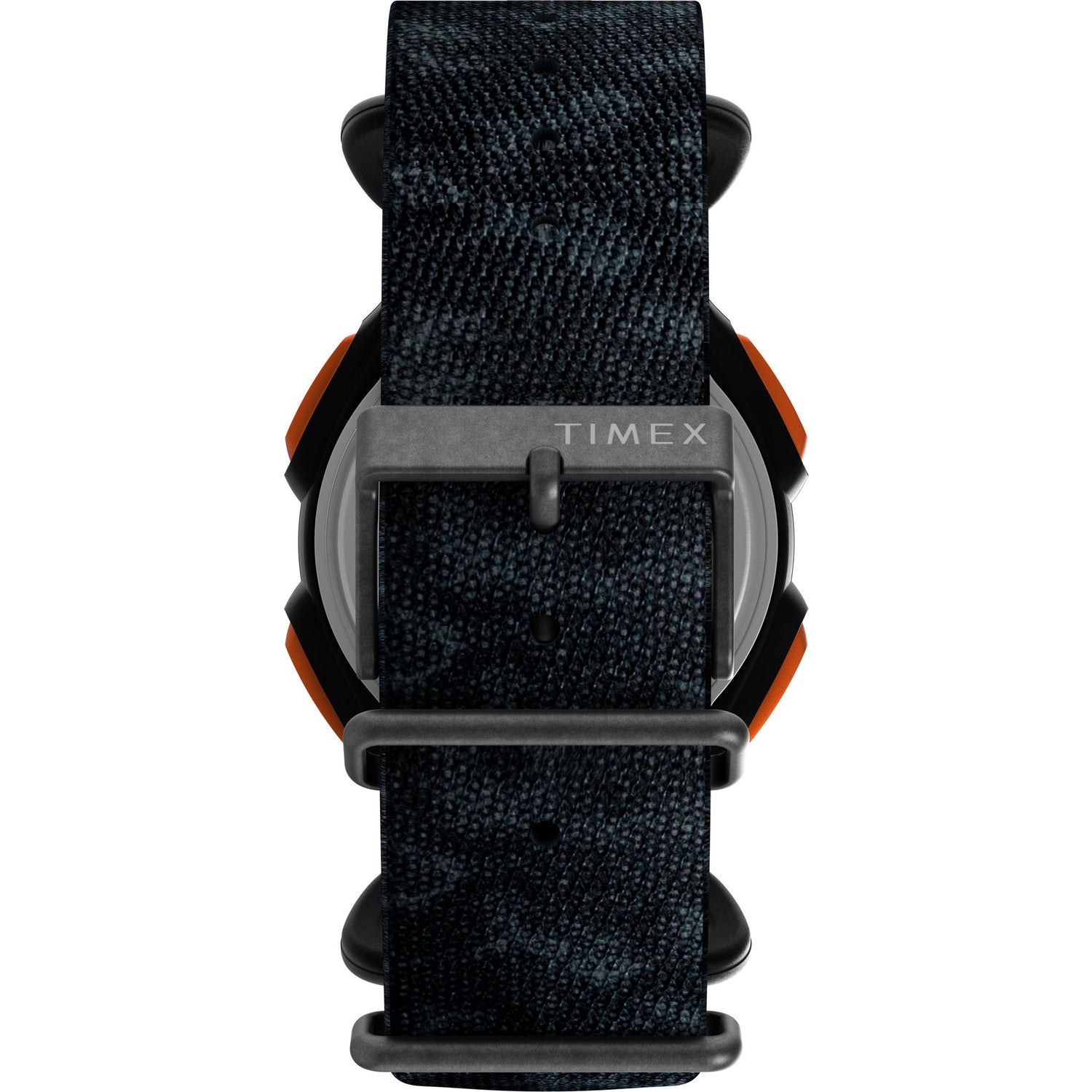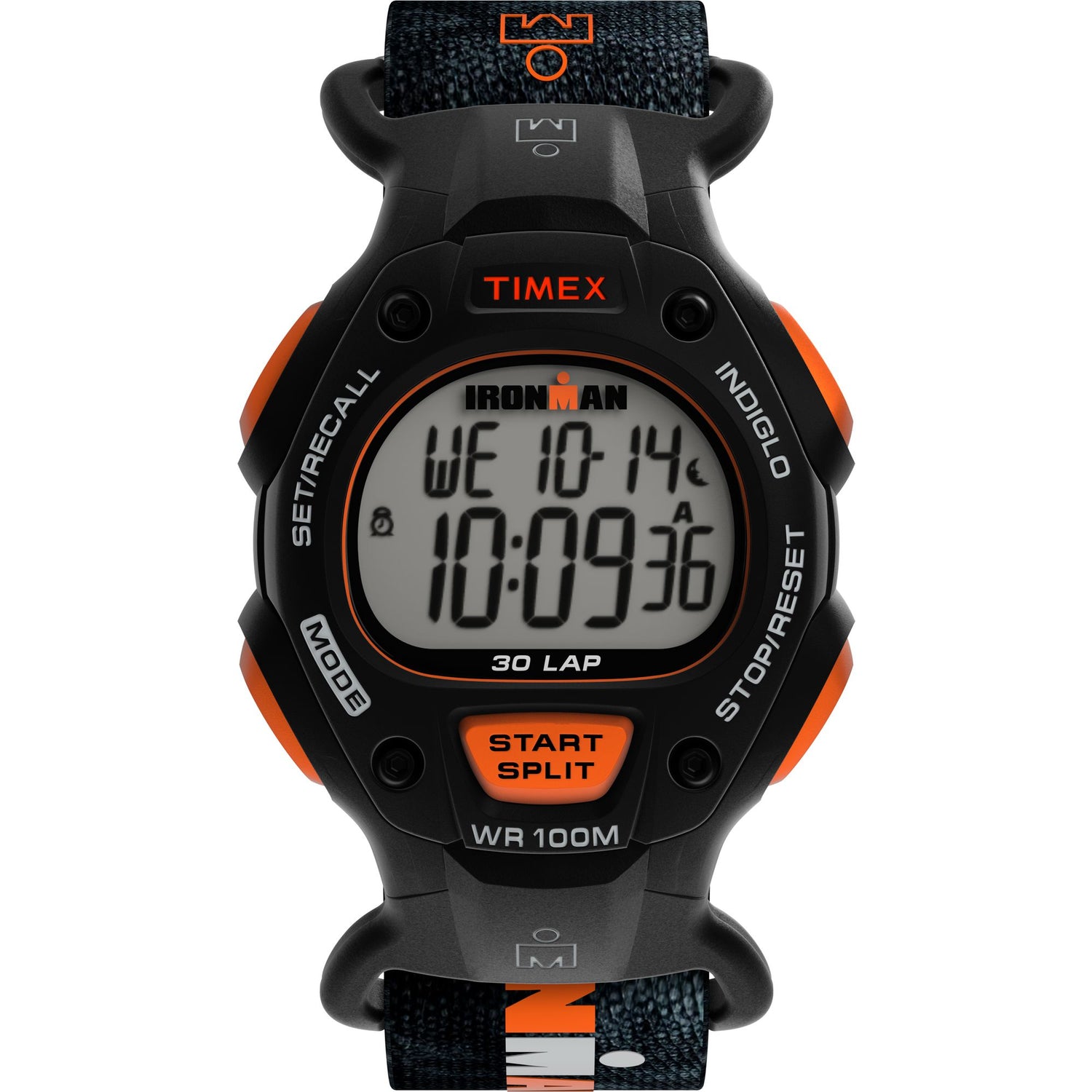 - Descripción: Reloj TIMEX® IRONMAN® Classic 30-Lap de 38 mm con caja de resina negra con acentos naranjas y acabado arenado, correa Slip-thru de tela reciclada negra con hebilla plateada, pantalla digital con funciones deportivas y cronómetro, e iluminación Indiglo®; resistencia al agua de 100 metros.