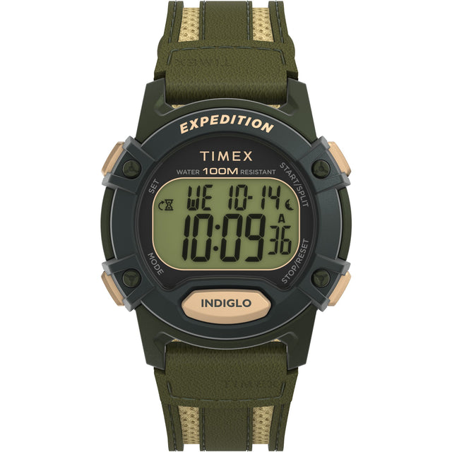 • Descripción: Reloj digital Expedition CAT5 con caja de resina verde de 41mm, correa de cuero verde y tela beige de dos piezas, esfera digital e iluminación Indiglo®.