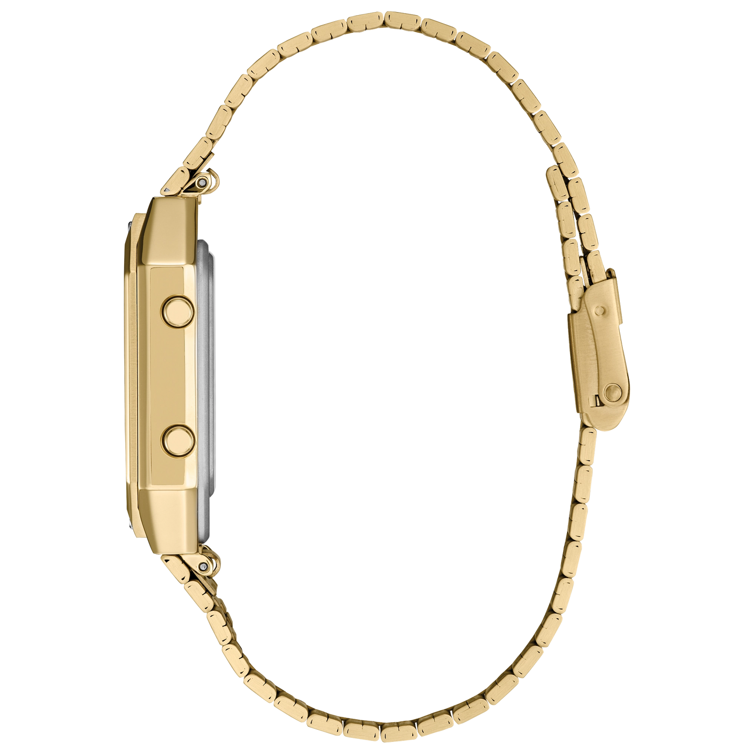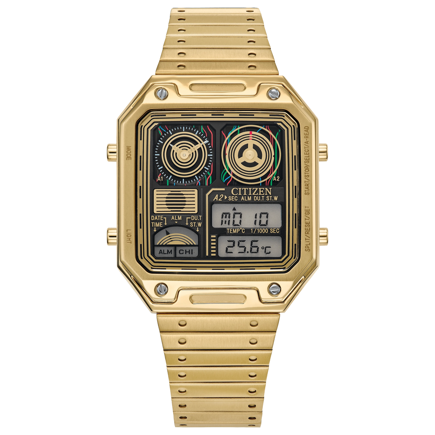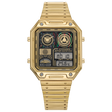 Reloj digital multifunción de estilo contemporáneo con acabado en tono dorado, diseñado para ofrecer información avanzada como doble horario, cronógrafo de alta precisión y medición de temperatura.