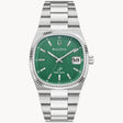Reloj Bulova modelo 96B439 con movimiento HPQ Precisionist NM10 de alta frecuencia, caja de acero inoxidable plateado de 37.5 mm, cristal de zafiro antirreflectante resistente a impactos, esfera verde con detalles plateados e indicadores luminiscentes, brazalete de acero inoxidable y resistencia al agua de 30 metros.