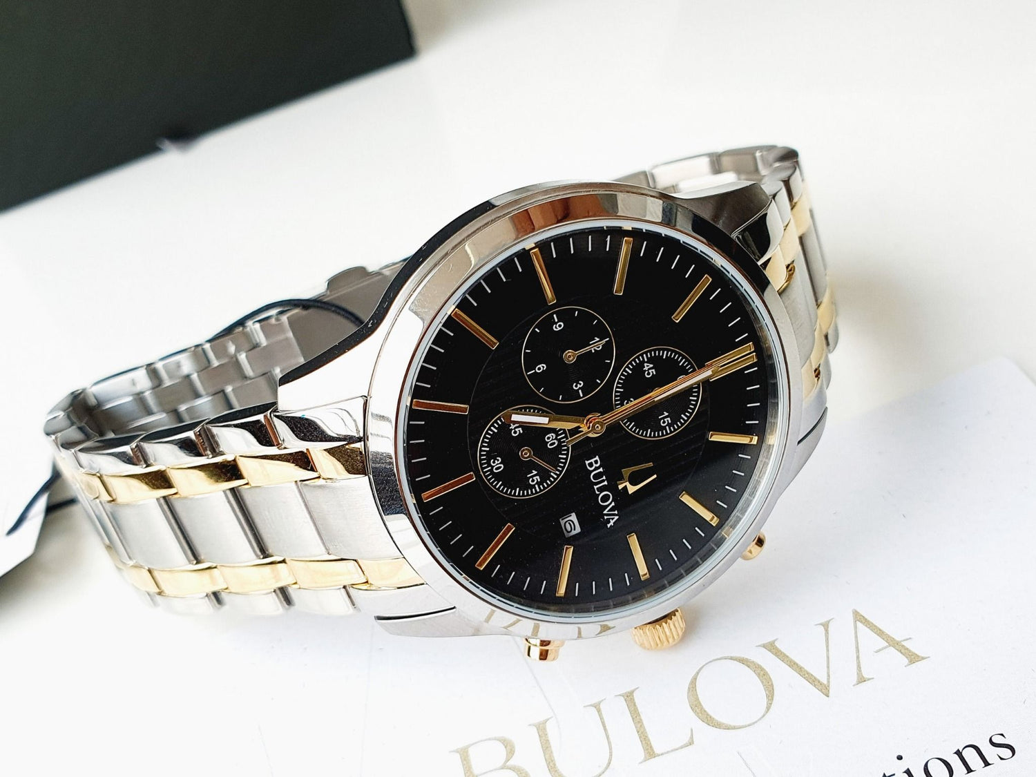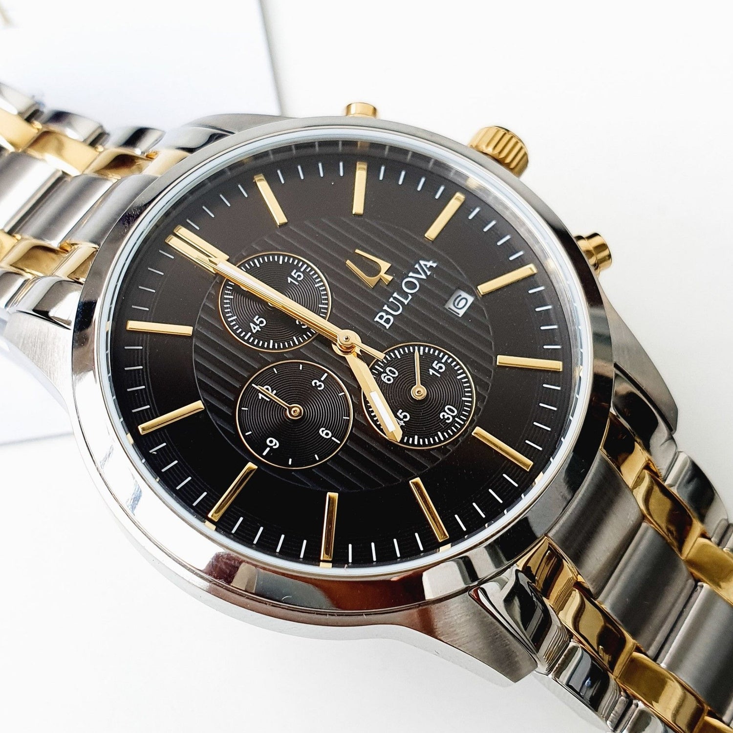 - Descripción: Reloj para hombre de la colección Classic de Bulova, con un diseño elegante y masculino. Presenta una caja de acero inoxidable de 44 mm y una pulsera ajustable de acero inoxidable en dos tonos, combinando estilo y resistencia. Su esfera negra incluye manecillas luminiscentes, subesferas de cronógrafo y un cristal mineral resistente a los arañazos. Ideal para ocasiones formales o de uso diario, este reloj ofrece un equilibrio perfecto entre funcionalidad y sofisticación.