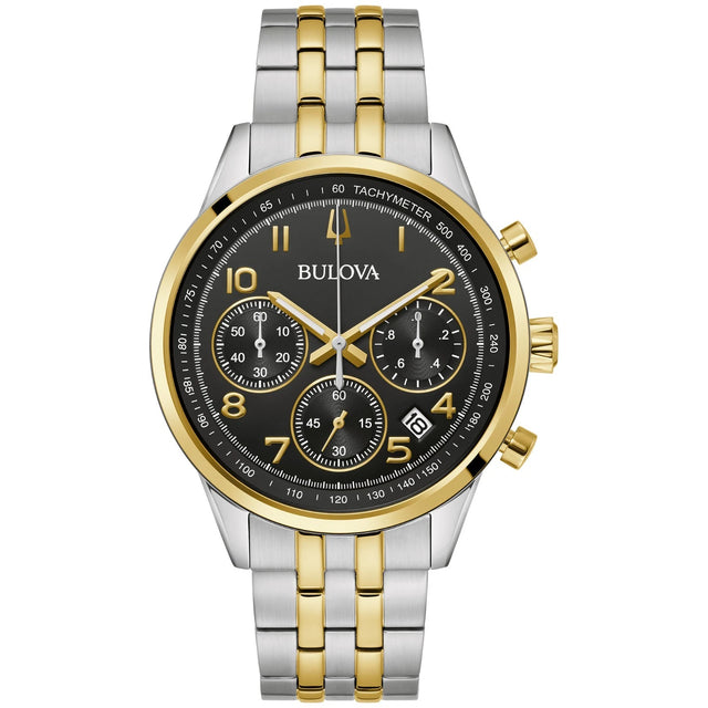 Reloj de vestir Classic con caja de acero inoxidable bicolor de 42 mm, correa de acero bicolor y esfera negra con cronógrafo y pequeña segundera.