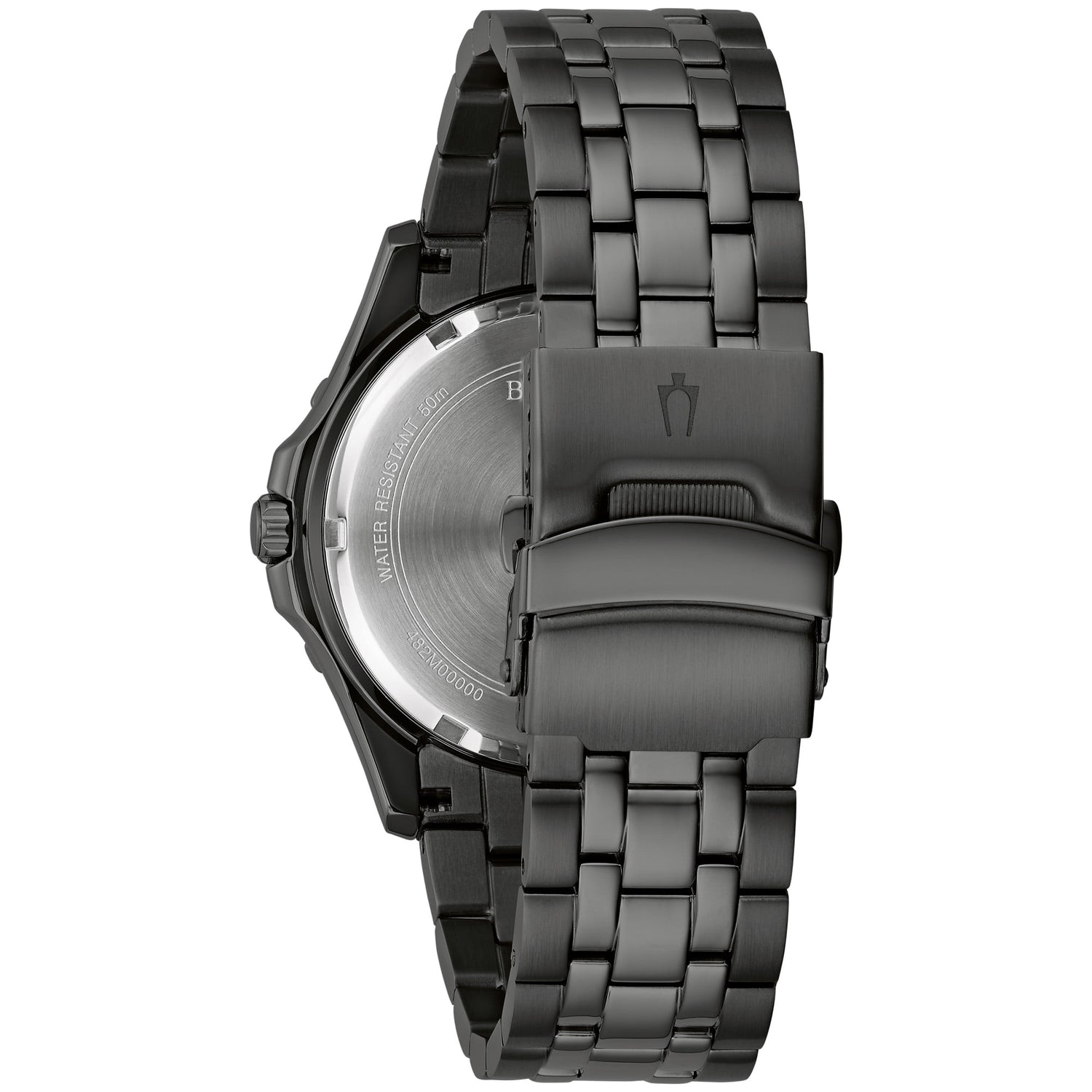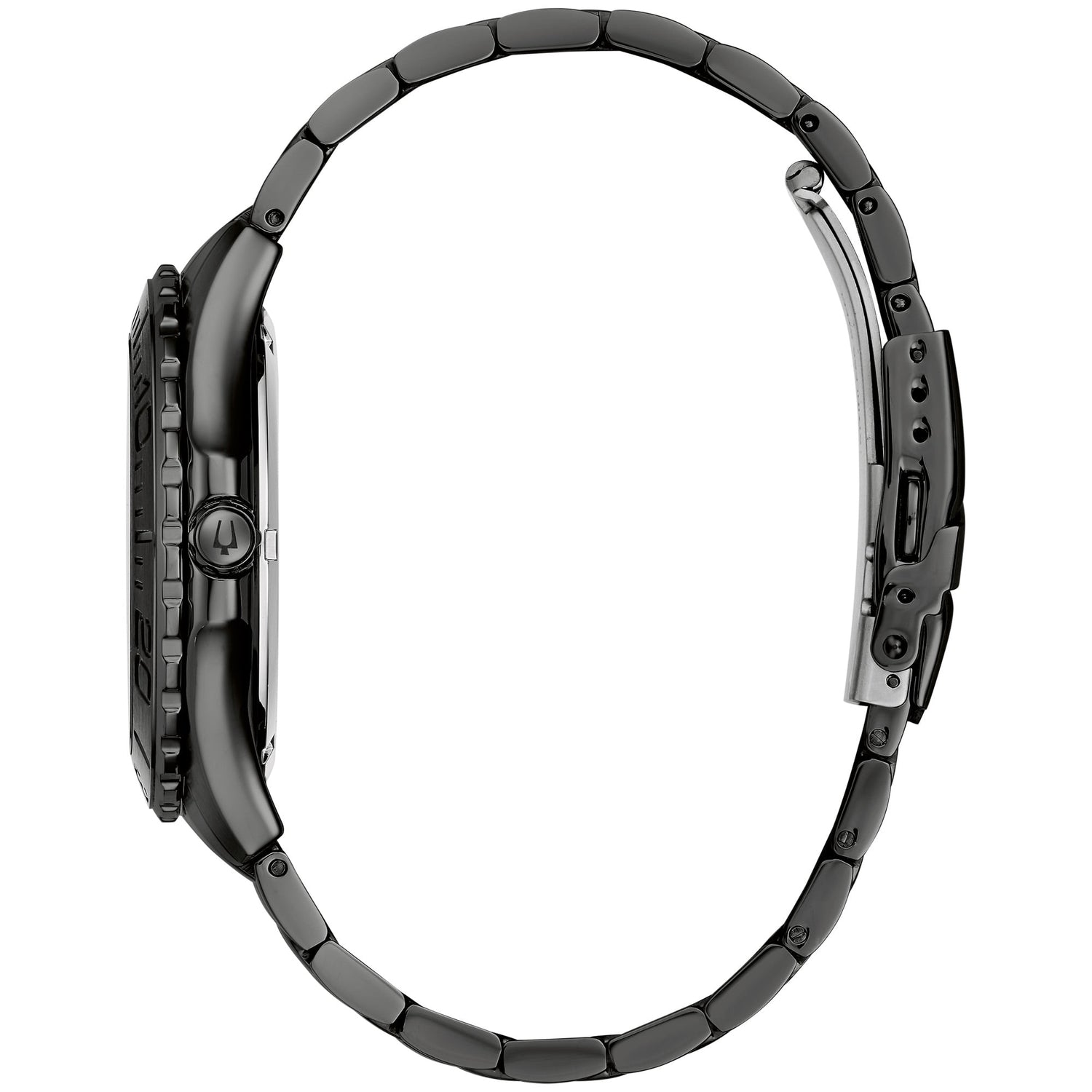 Reloj Bulova para hombre con caja de acero inoxidable negro de 42 mm, correa de acero a juego y esfera negra con textura de onda oceánica.