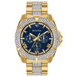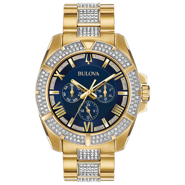 De la exclusiva colección Crystal, el Bulova 98C128 destaca por su diseño llamativo y lujoso. Fabricado en acero inoxidable en tono dorado y adornado con 318 cristales Swarovski colocados a mano en el bisel, la esfera azul y el brazalete, este modelo ofrece un estilo brillante y sofisticado. Su movimiento multifunción de seis manecillas muestra día, fecha y formato 24 horas, acompañado de manecillas e indicadores luminosos. Un reloj diseñado para quienes buscan presencia y distinción.