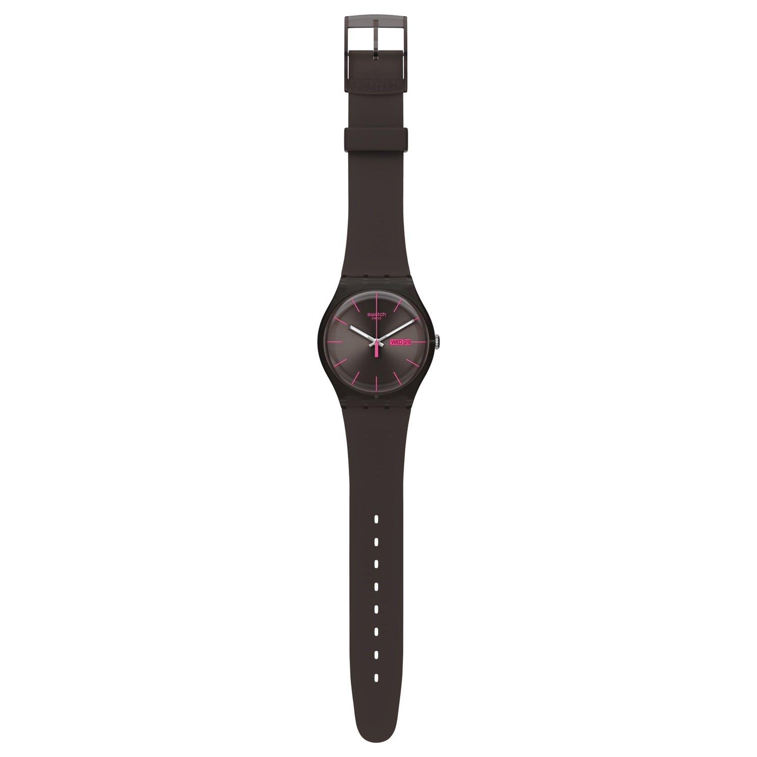 El Swatch Brown Rebel SUOC700 destaca por su estética monocromática en tono café con acentos rosados que aportan un carácter moderno y juvenil. Ligero y deportivo, es una pieza versátil para el uso diario con espíritu urbano.