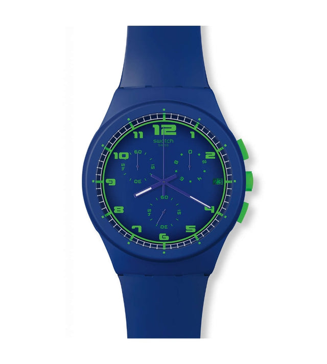 Reloj Swatch Originals en tono azul royal con acentos verdes que resaltan su carácter dinámico. Diseño ligero en plástico con cronógrafo funcional y estética moderna ideal para uso diario.