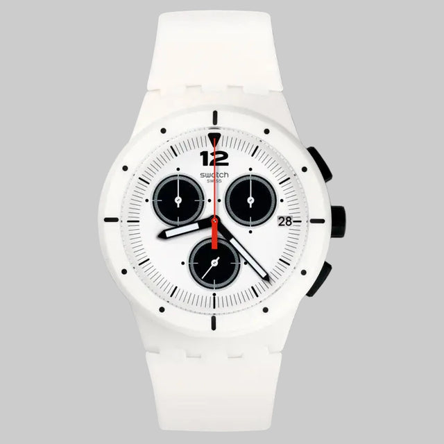El Swatch WHY AGAIN combina un diseño minimalista en blanco y negro con la ligereza característica de la marca. Su construcción cómoda y su movimiento de cuarzo lo convierten en una pieza práctica y versátil para uso diario.