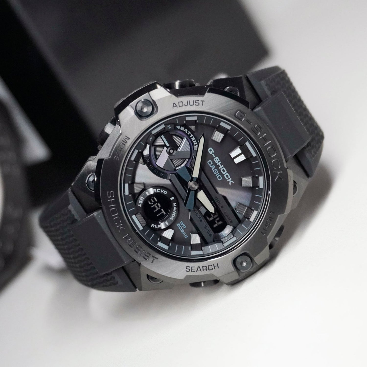 - Descripción: Reloj G-Shock con diseño Carbon Core Guard, resistente a impactos y con estructura de resina y acero inoxidable. Alimentado por energía solar (Tough Solar) y con conectividad Bluetooth® para sincronización automática de hora mediante la app CASIO WATCHES. Combina pantalla analógica y digital, luz LED doble Super Illuminator, hora mundial, cronómetro, temporizador y 5 alarmas. Ofrece resistencia al agua de 200 metros y gran autonomía energética con función de ahorro de energía.