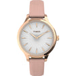 - Descripción: Caja en tono oro rosa con correa rosa de cuero y esfera blanca