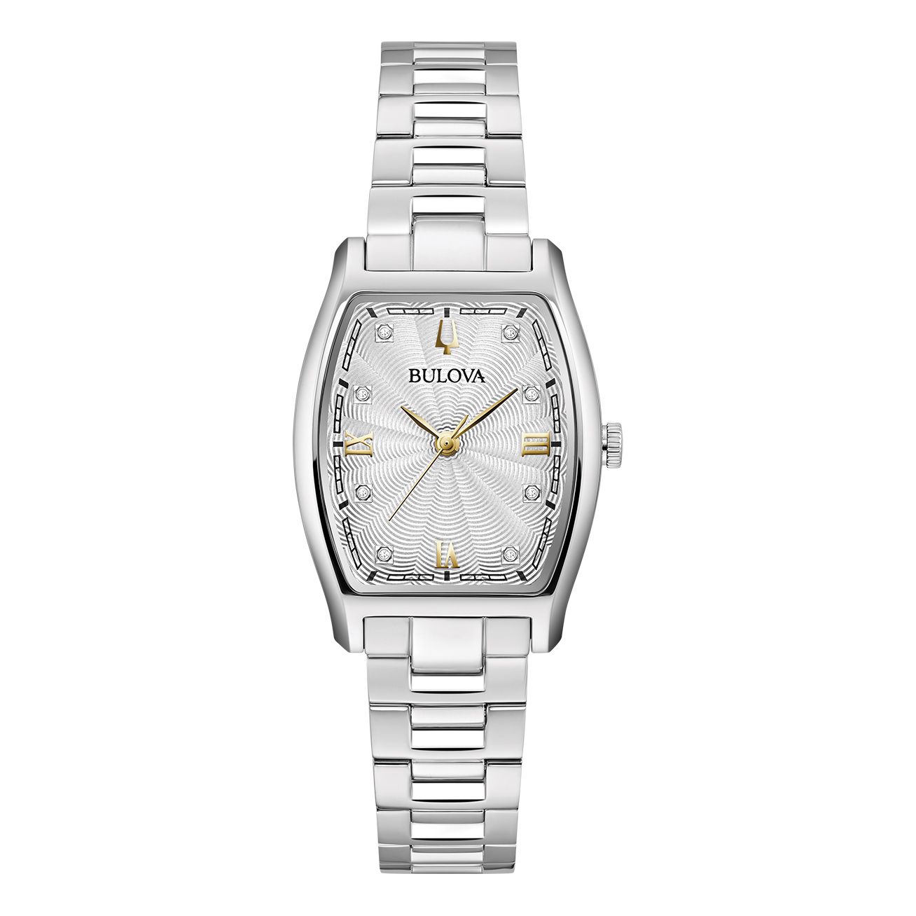 • Descripción: De la elegante Colección Diamantes de Bulova, este reloj para mujer destaca por su diseño sofisticado y detalles de lujo. Presenta una carátula plateada texturizada con 8 diamantes genuinos montados a mano como indicadores, que reflejan la luz con elegancia. Su caja estilo tonneau y brazalete de acero inoxidable con cierre desplegable de doble pulsador combinan durabilidad y distinción. Equipado con un movimiento de cuarzo japonés de 3 manecillas y cristal mineral resistente, ofrece precisión y estilo refinado para toda ocasión.