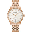 Reloj Bulova 97P152 que combina lujo, elegancia y precisión. Elaborado en acero inoxidable con acabado oro rosa, destaca por su esfera blanca de nácar con seis diamantes engastados a mano. Su diseño refinado y su movimiento de cuarzo japonés ofrecen un equilibrio perfecto entre estética y rendimiento, ideal para ocasiones especiales o el uso diario.