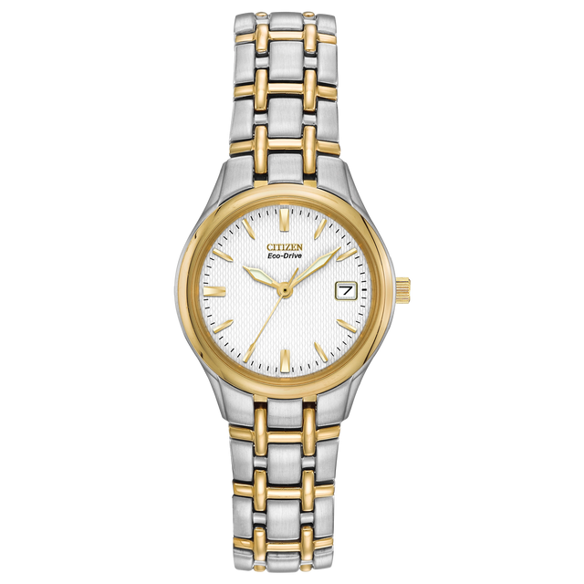 Reloj versátil y elegante de perfil refinado, ideal para el uso diario. Su diseño bicolor y carátula blanca limpia se combinan con la tecnología Eco-Drive para un desempeño confiable sin necesidad de baterías.