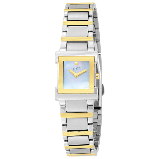 Elegante reloj cuadrado de acero para mujer con esfera blanca nacarada, correa bicolor y tecnología Eco-Drive que se alimenta de la luz.