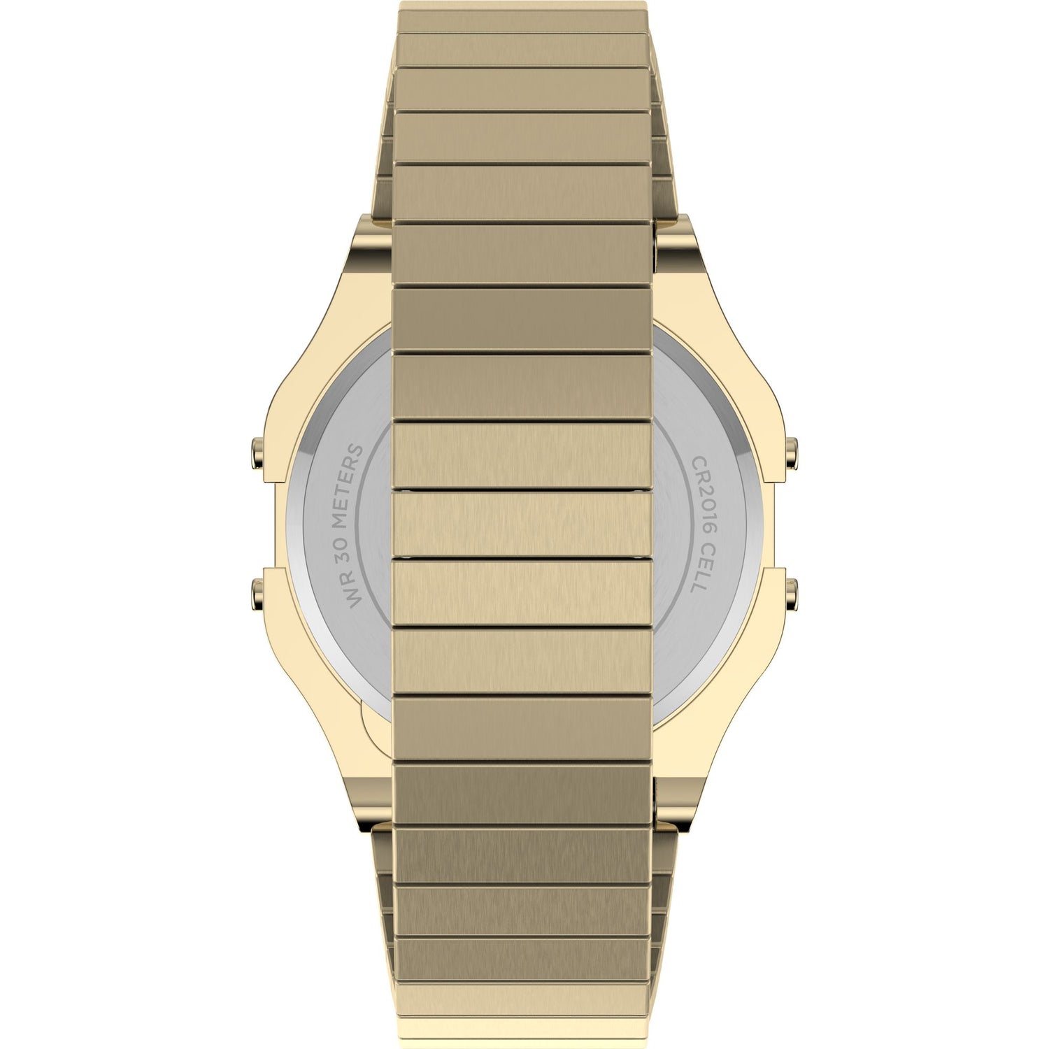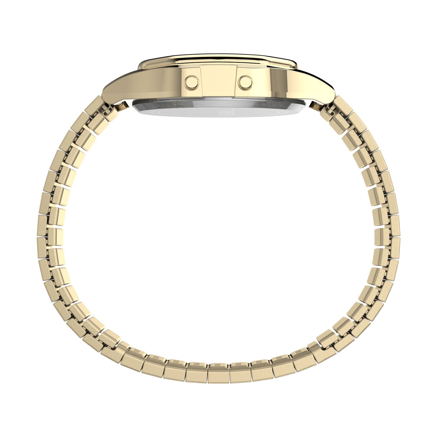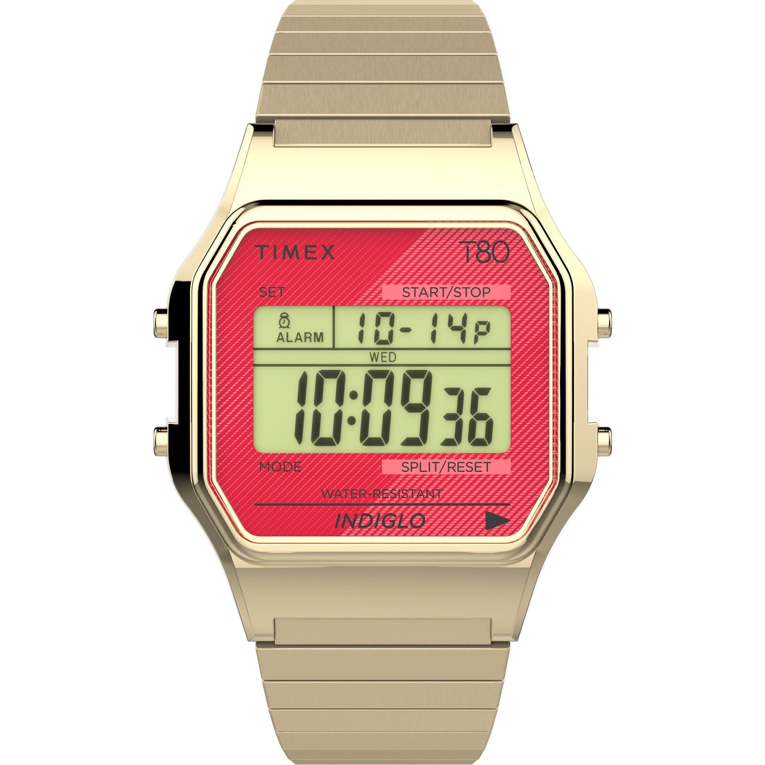 - Descripción: Reloj digital T80 retro con caja dorada pulida de 34mm de forma única, banda de expansión Perfect Fit dorada, lente color coral, esfera digital e iluminación Indiglo®.