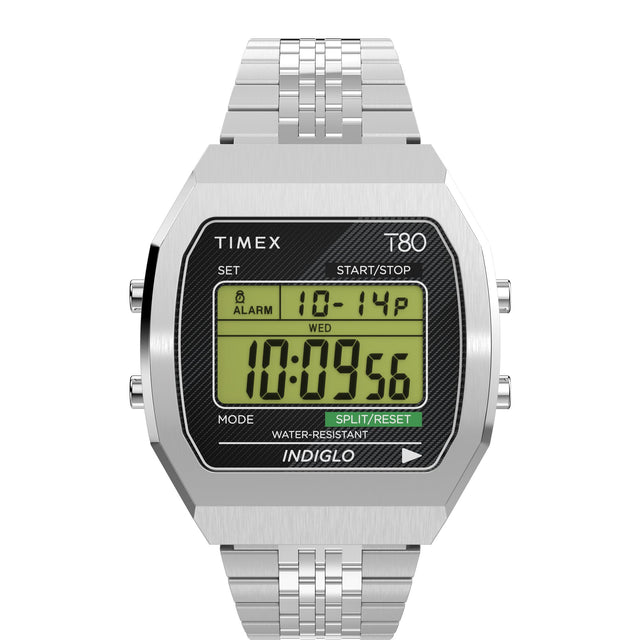 - Descripción: Reloj digital T80 Steel con caja de acero inoxidable cepillada/pulida de 36mm de forma especial, brazalete de acero inoxidable autoajustable, lente negra, esfera digital e iluminación Indiglo®.