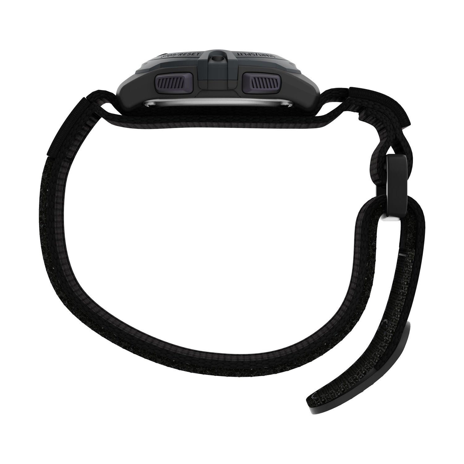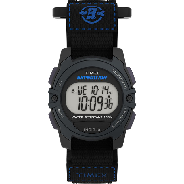 - Descripción: Reloj Timex Expedition® de tamaño mediano con caja de resina negra, correa Fastwrap® de nailon negro con cierre de velcro, pantalla digital con funciones de cronógrafo, alarma y temporizador, e iluminación Indiglo®; resistencia al agua de 100 metros.