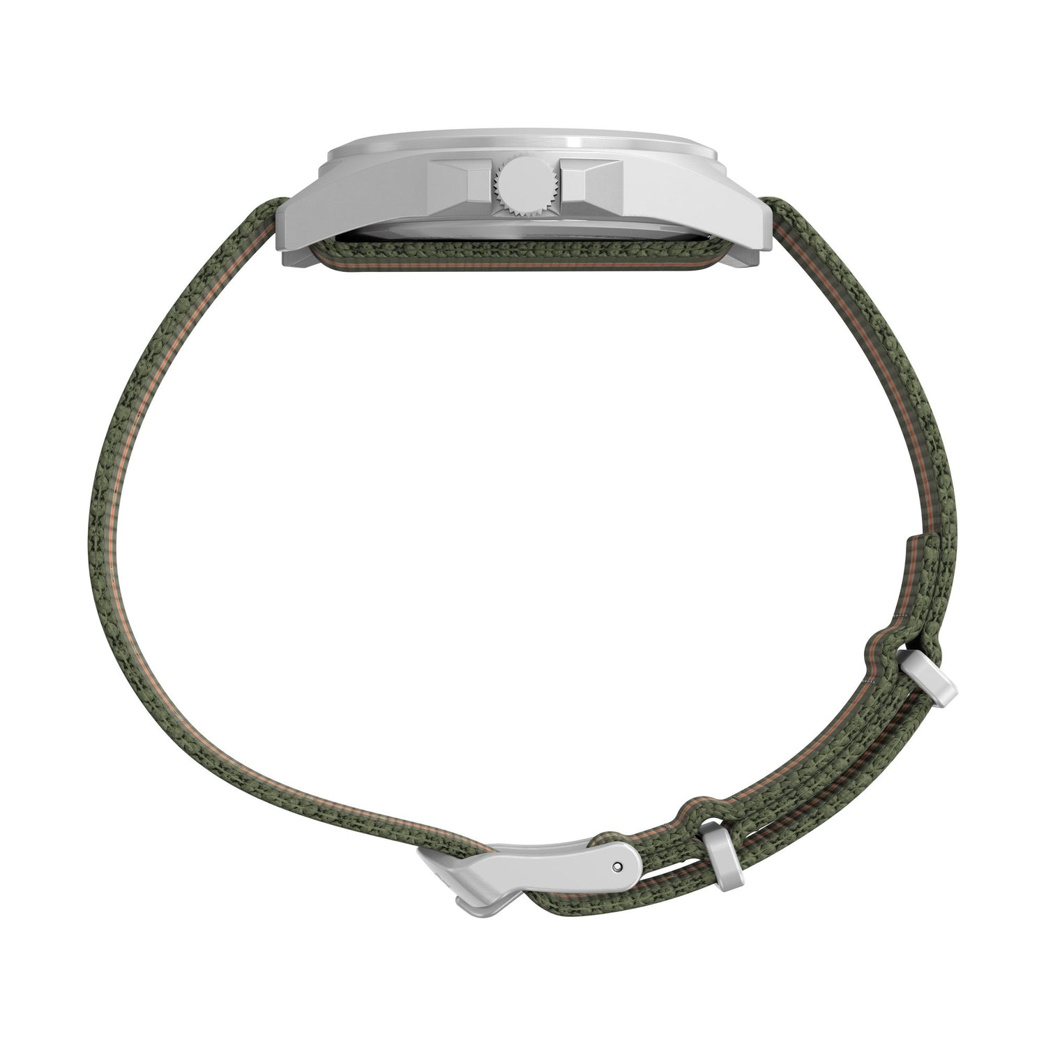 - Descripción: Reloj Expedition Field con caja plateada cepillada/arenada de 36mm, correa deslizante verde de una capa de tela, esfera verde con números arábigos completos e iluminación Indiglo®.
