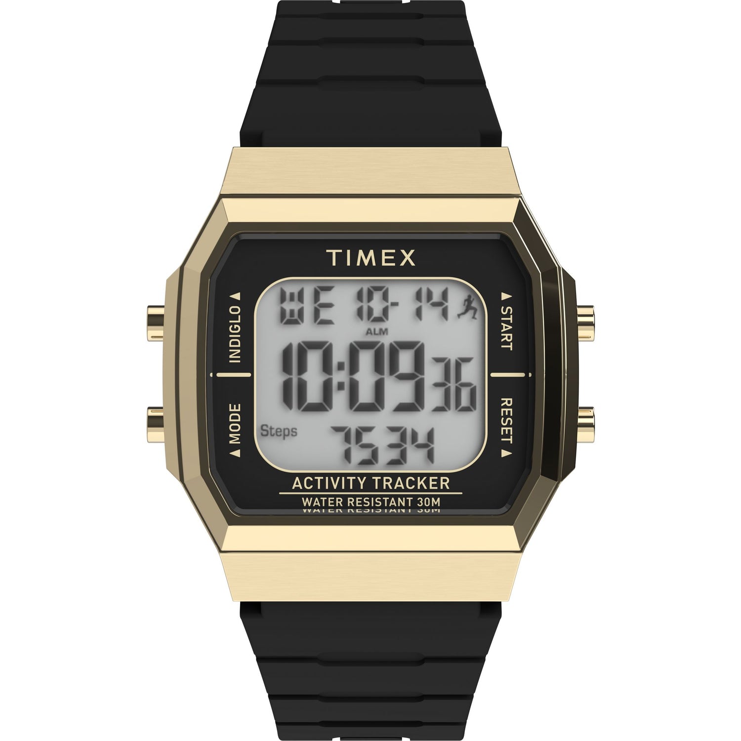 - Descripción: Rastreador de actividad y pasos con caja octogonal dorada pulida de 40mm, correa de silicona verde y pantalla digital con iluminación Indiglo®.