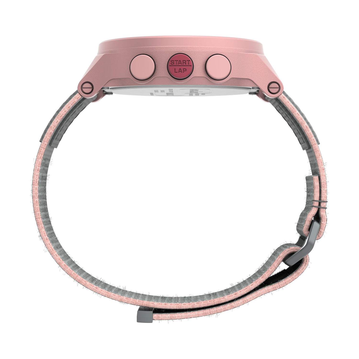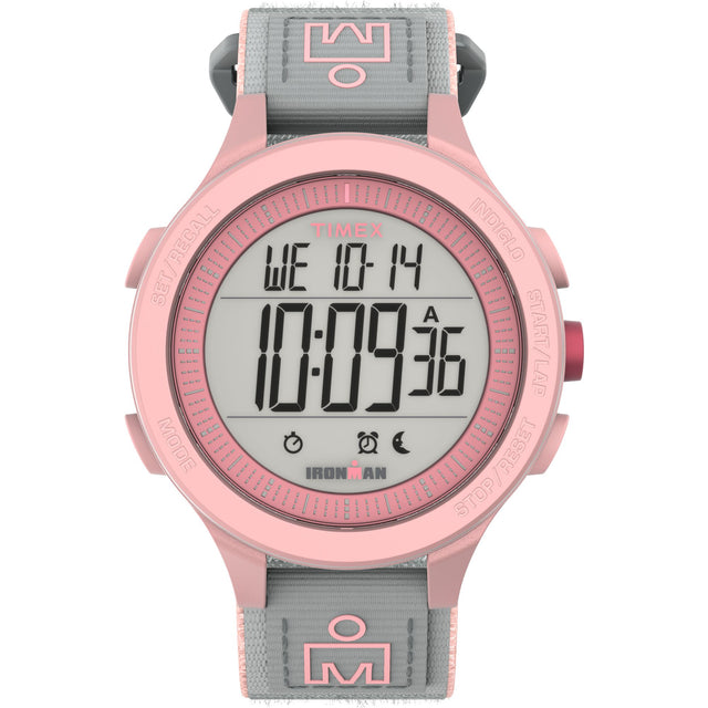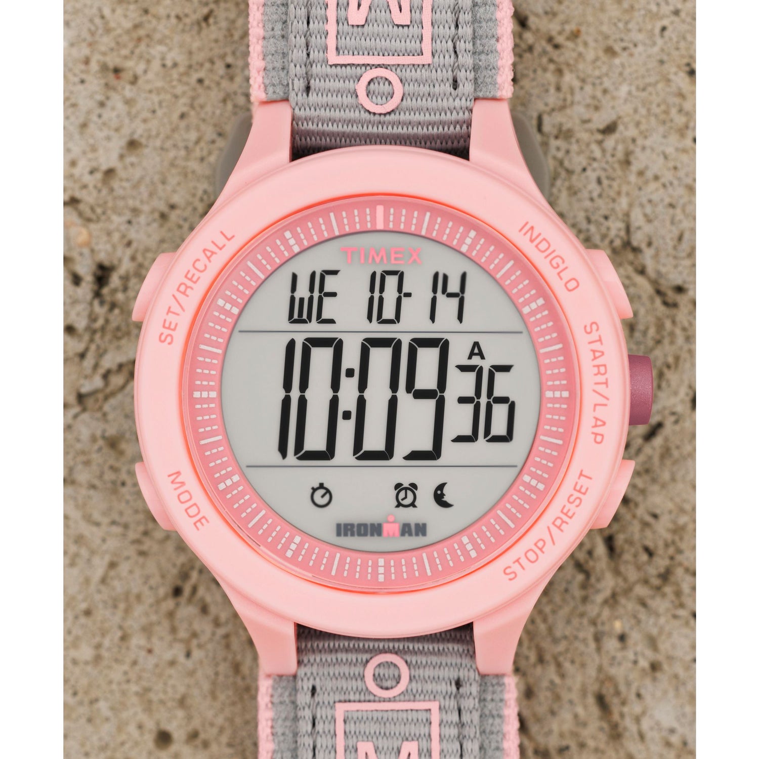 - Descripción: Reloj Ironman para mujer con caja de resina rosa de 42 mm, correa FastWrap de tela elástica gris y pantalla digital. Incluye tecnología de iluminación Indiglo®.