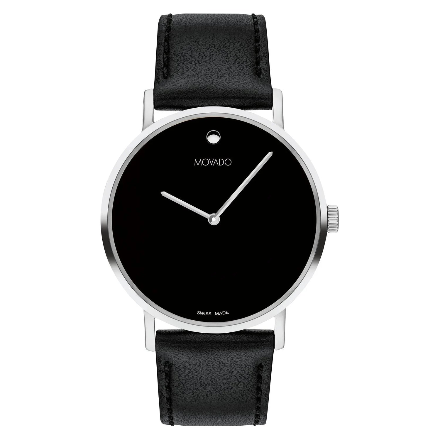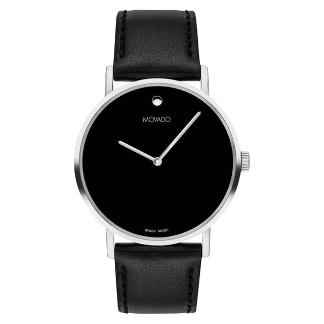 Un ícono del diseño contemporáneo. El Movado Signature combina la pureza del icónico dial Museum en negro con una caja de acero inoxidable y una correa de piel que aporta elegancia minimalista. Un reloj refinado, moderno y universal.