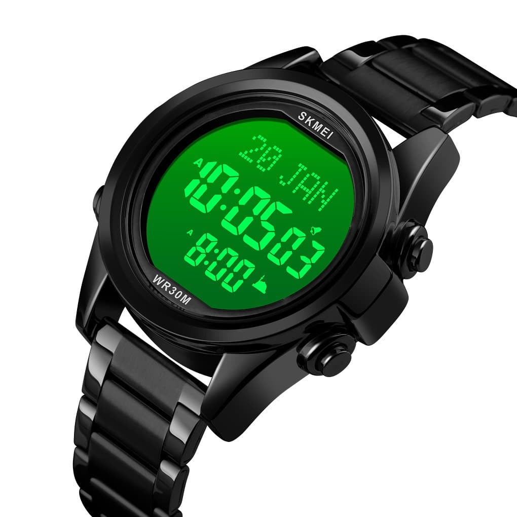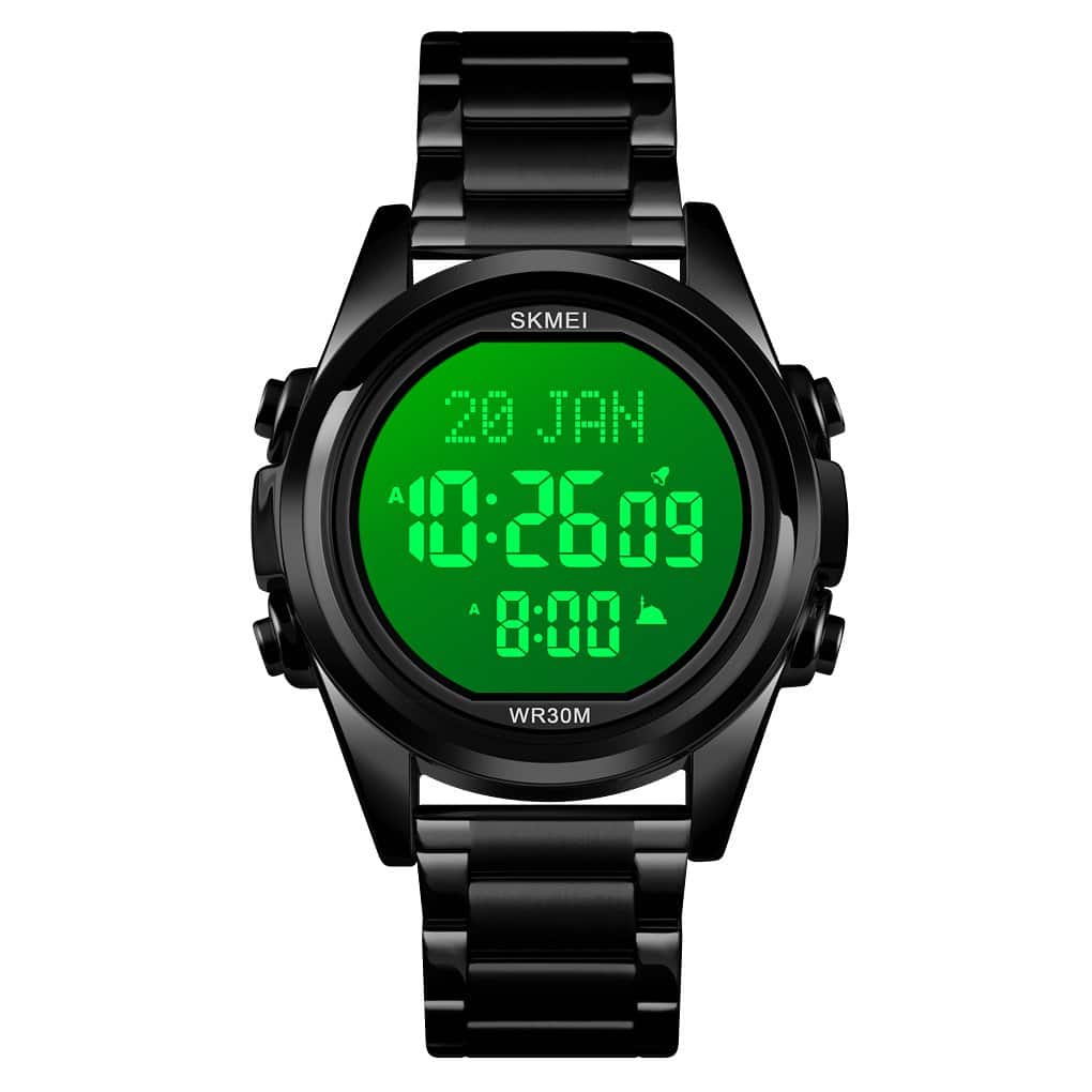 - Función: recordatorio de tiempo de peregrinación, mes religioso, día religioso, calendario gregoriano, fecha de la ciudad, horario de verano, marcador, selección de idioma, ajuste de volumen, tiempo de batería restante, cronómetro, alarma, fecha, semana, Luz LED, reloj de 12/24 horas.