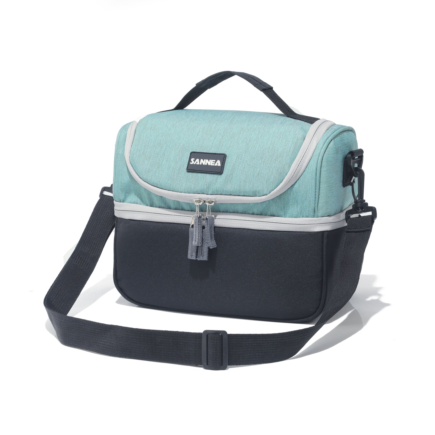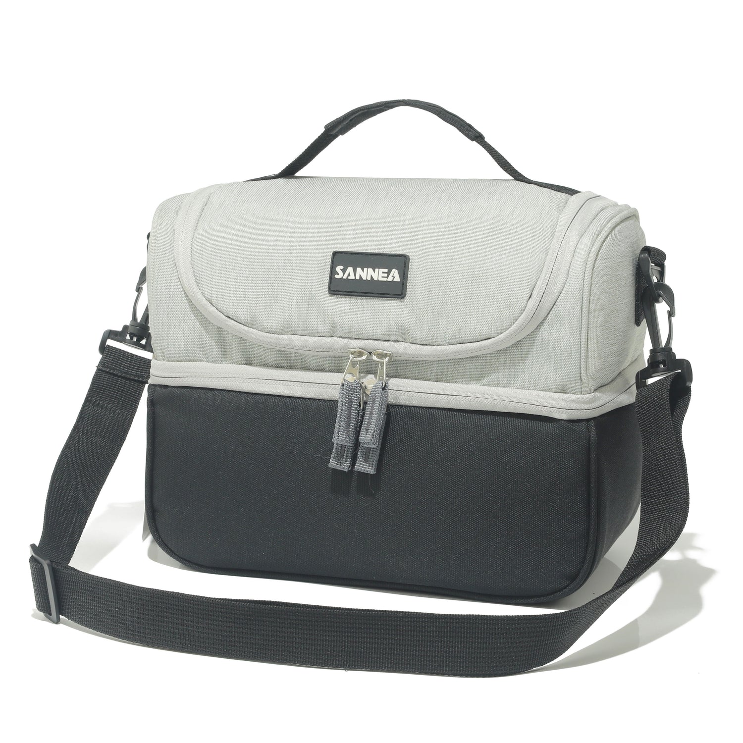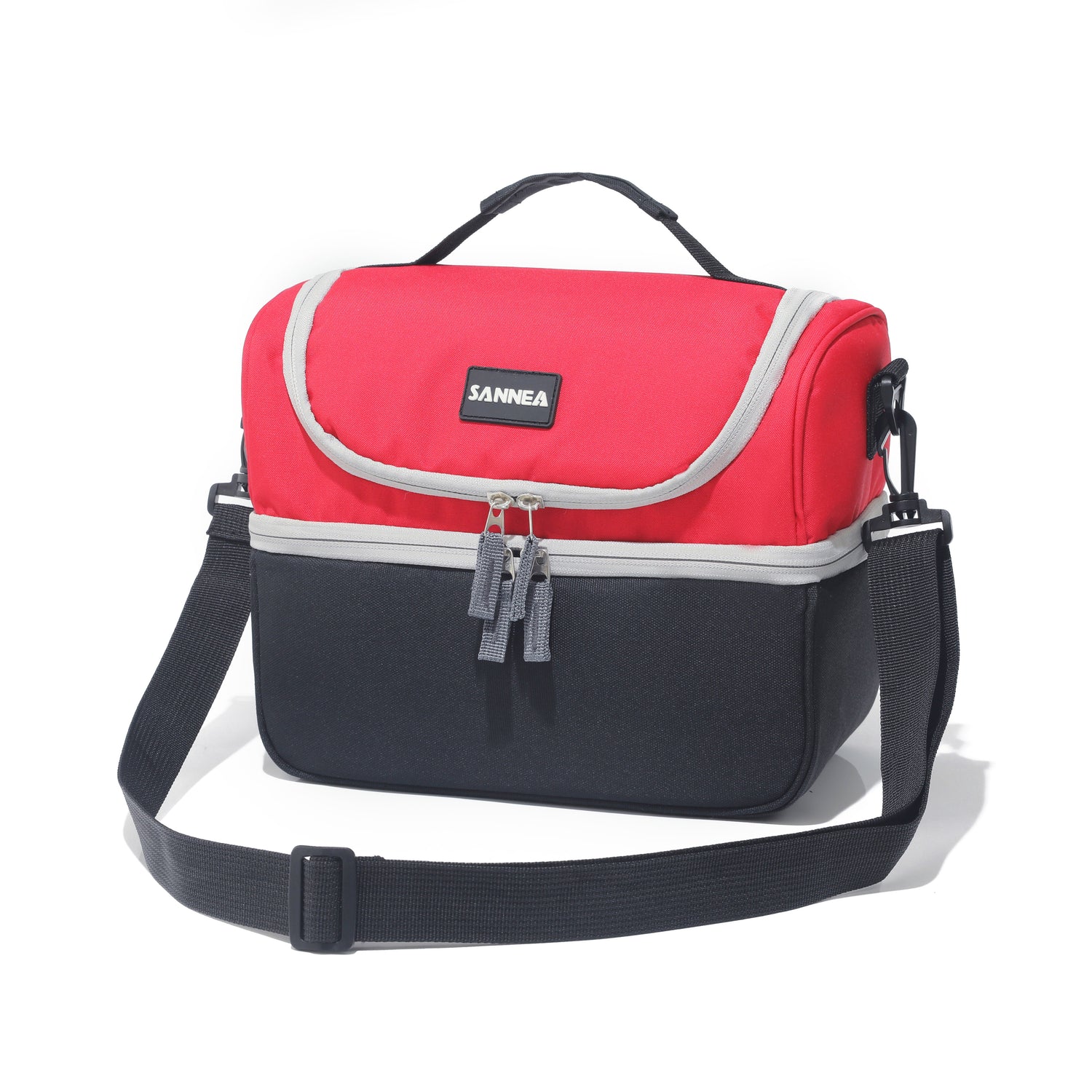 La lonchera de diseño práctico y moderno, con un compartimento amplio y seguro que se cierra con un resistente zipper. El cuerpo principal de la lonchera es de color gris claro, proporcionando una base neutra y elegante. Los detalles de acento, como las costuras y el borde del zipper, son de color rojo vibrante, que añade un toque llamativo y atractivo. En los laterales, tiene paneles en un color celeste suave, dándole un aspecto fresco y juvenil. Además, el asa superior y las esquinas están reforzadas con un tono navy profundo, aportando contraste y durabilidad. Esta combinación de colores hace que la lonchera sea moderna y versátil, perfecta para llevar al trabajo, la escuela o cualquier salida al aire libre.