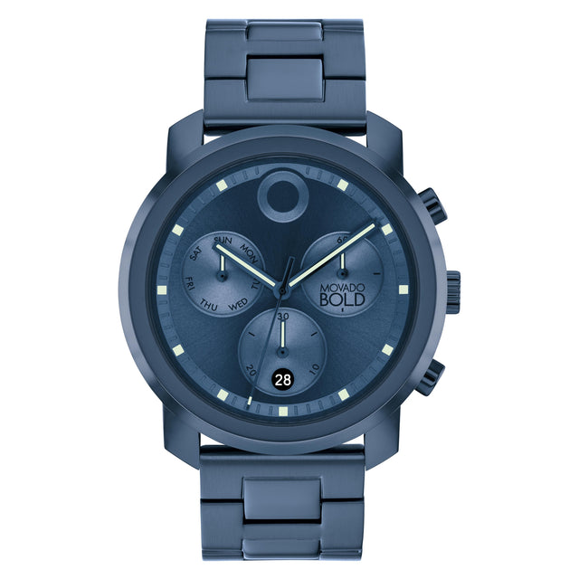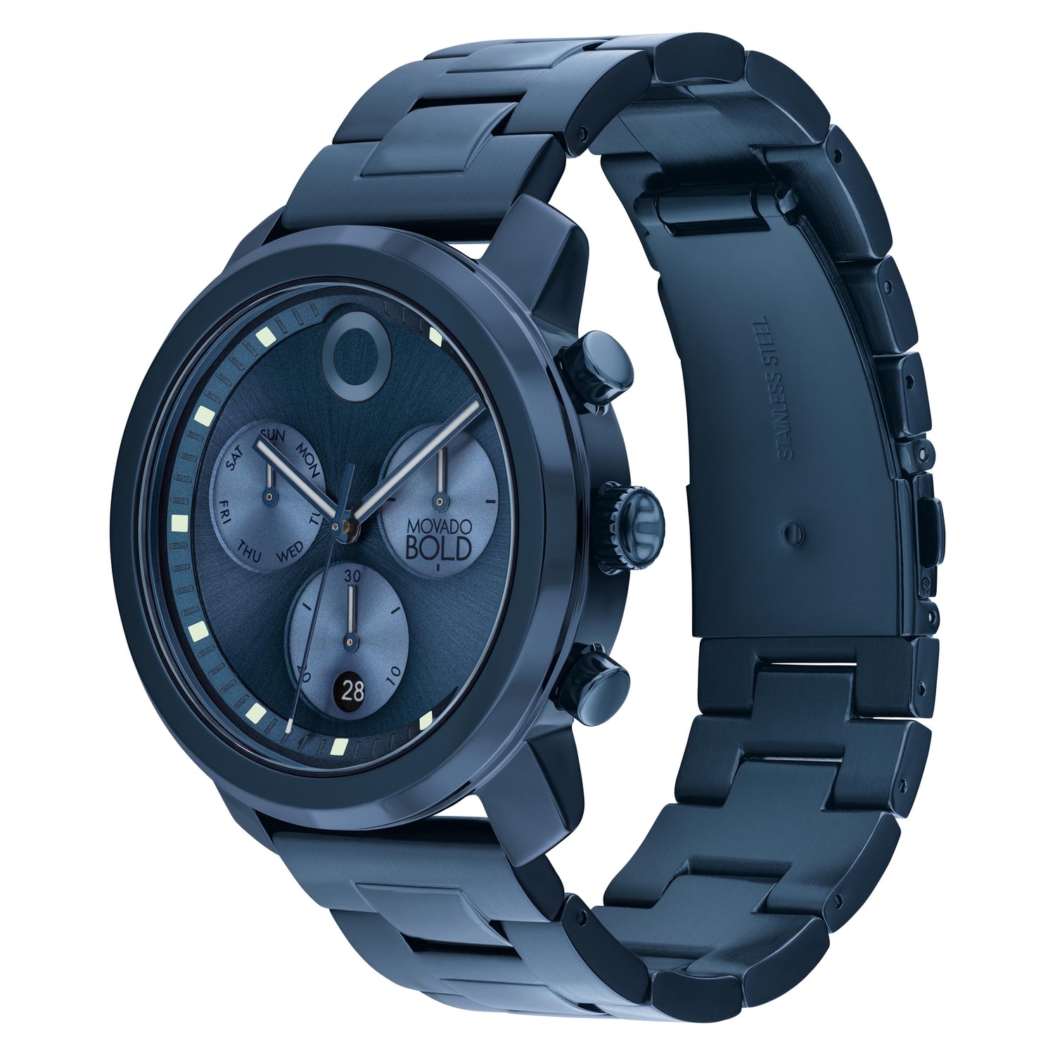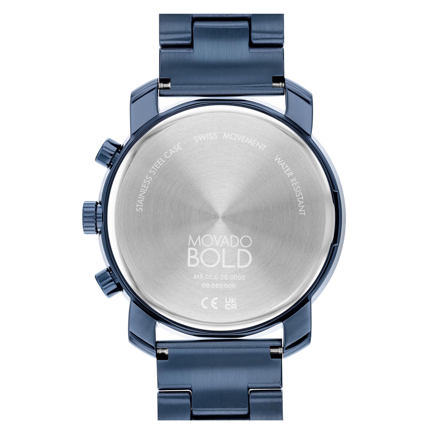 Reloj Movado Trend Propel Chronograph con un diseño moderno y vanguardista. Su caja y brazalete de acero inoxidable con recubrimiento iónico azul ofrecen una apariencia elegante y distintiva. La carátula azul con el icónico punto Movado refleja el equilibrio entre estilo contemporáneo y precisión suiza.