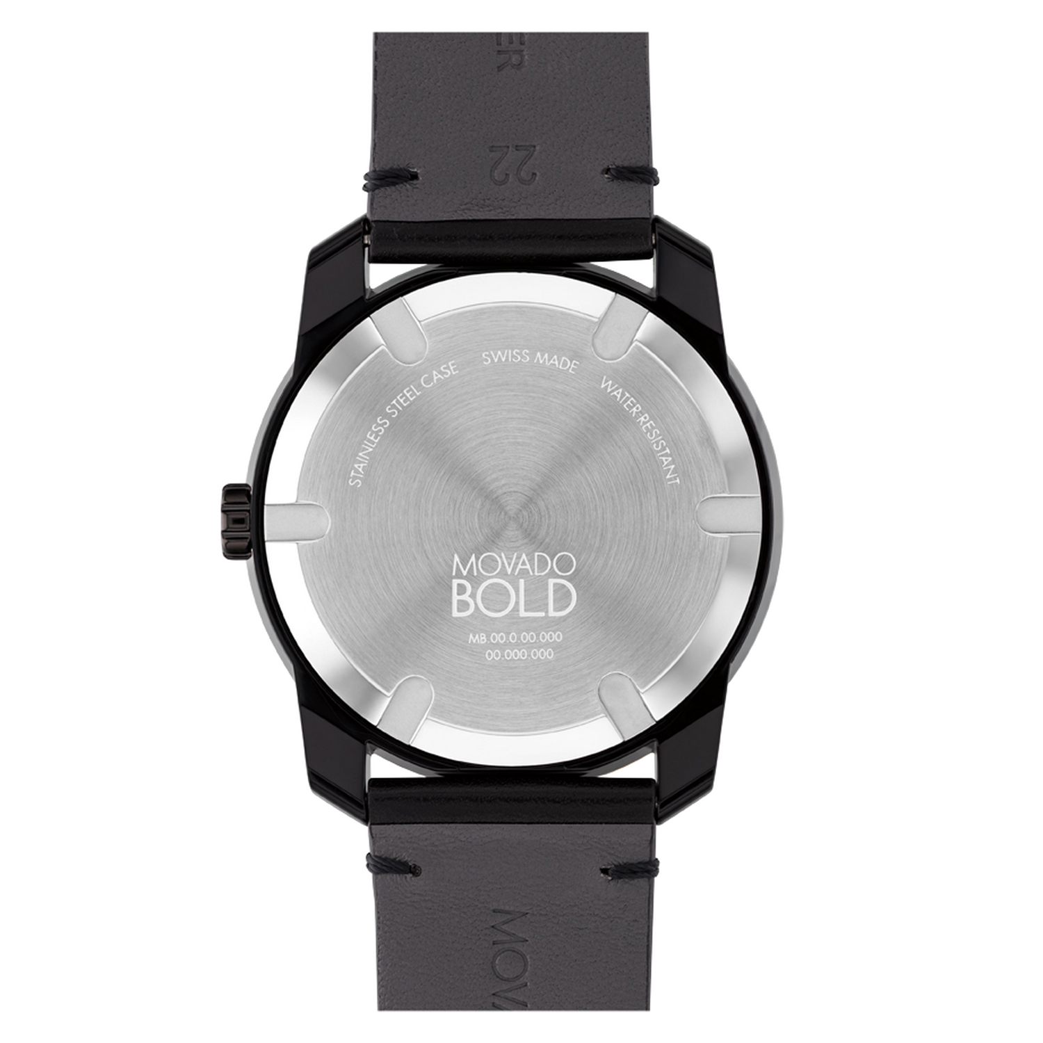 Reloj Movado Bold TR90 con un diseño minimalista y elegante. Su caja negra de material compuesto TR90 y acero inoxidable se combina con una correa de piel negra para un estilo moderno y sofisticado. La carátula negra con índices y manecillas luminiscentes refleja el distintivo diseño “Museum” de Movado.