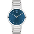 Reloj Movado Bold Horizon con diseño minimalista y moderno, parte de la colección Otoño/Invierno 2024. Su carátula azul con manecillas plateadas y caja de acero inoxidable plateado reflejan la elegancia característica de Movado. Una pieza suiza de líneas limpias y refinadas, ideal para quienes valoran la sofisticación contemporánea.