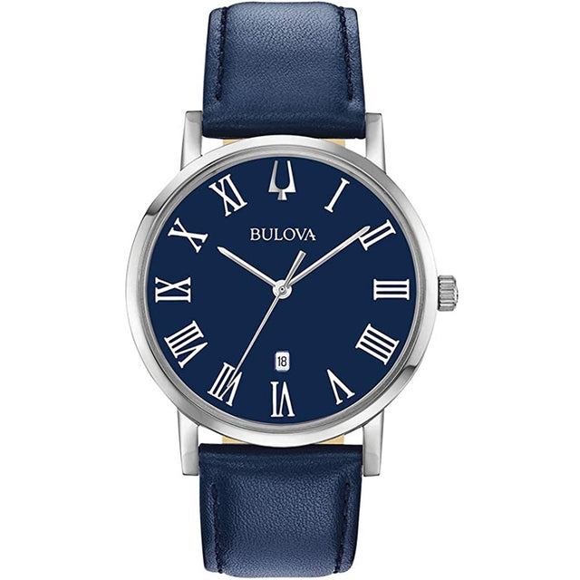 Reloj Bulova de la colección Classic con diseño sobrio y elegante. Presenta una carátula azul marino con fechador, movimiento de cuarzo japonés y correa de piel azul, ideal para un estilo formal o casual.