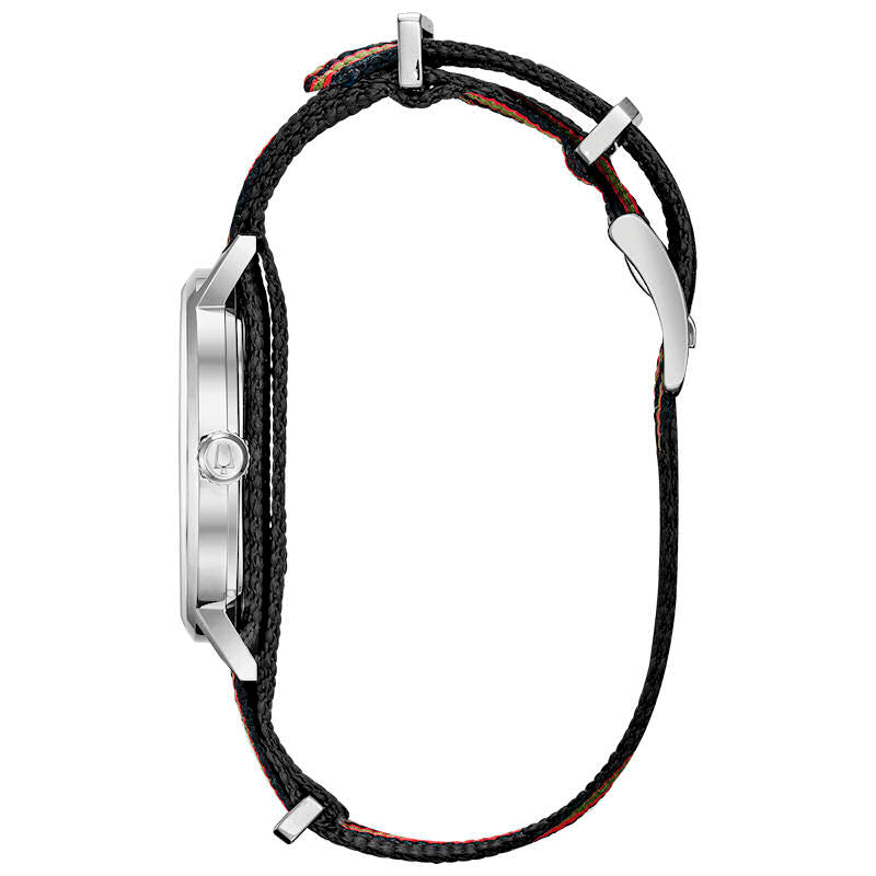 El Bulova Aerojet 96B317 combina un diseño clásico con un estilo contemporáneo inspirado en la aviación. Su caja delgada de acero inoxidable, correa tipo NATO tricolor y carátula negra minimalista crean una pieza versátil, ligera y elegante.