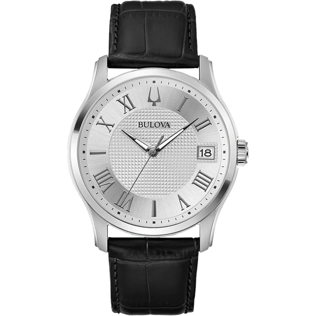 El Bulova Wilton 96B388 destaca por su elegancia clásica y versatilidad. Su carátula blanca con textura clous de paris, numerales romanos y correa de piel negra crean un estilo formal y sofisticado, ideal para uso diario o vestir.