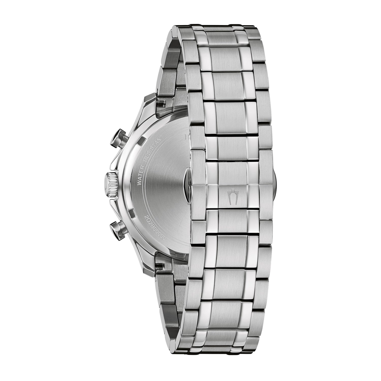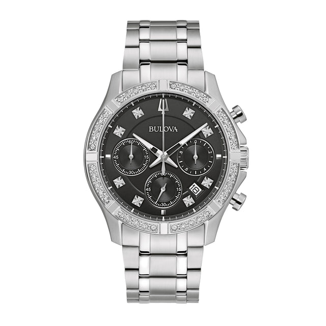 Reloj Bulova para hombre con diseño robusto y elegante, caja de acero inoxidable y carátula negra con detalles de diamante. Su brazalete metálico y su estilo cronógrafo lo convierten en un reloj llamativo y de presencia marcada.