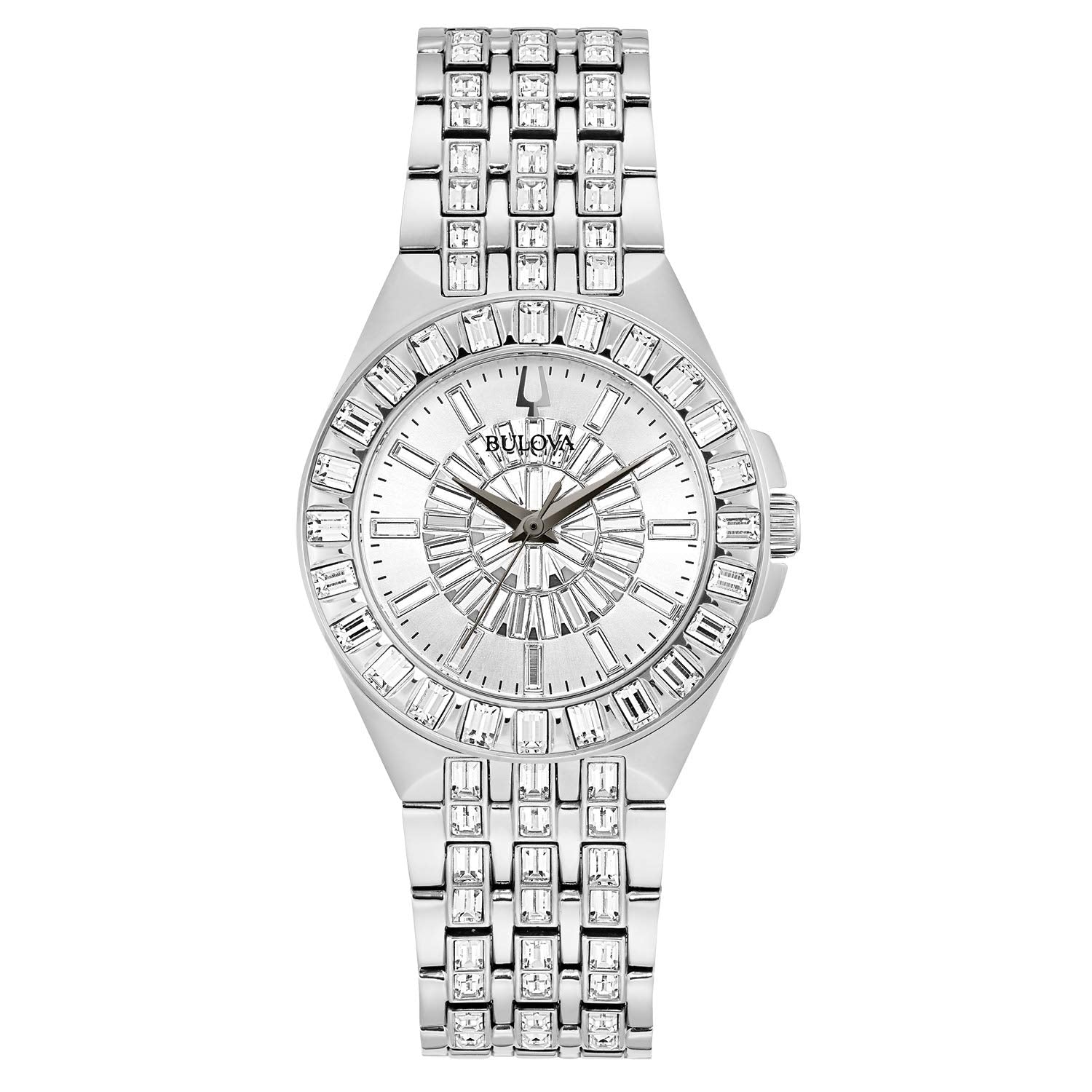 Reloj Bulova para mujer de la colección Phantom, diseñado para destacar con elegancia y brillo gracias a sus 110 cristales tipo baguette distribuidos en la pulsera, bisel y carátula. Su construcción en acero inoxidable y acabado plateado lo convierten en un accesorio sofisticado de estilo llamativo.