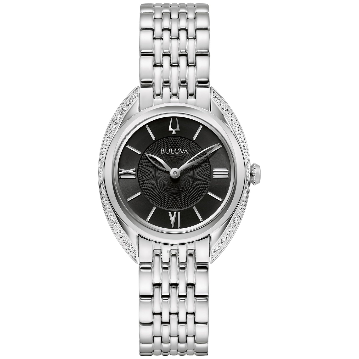Reloj Bulova para mujer de la colección Classic, con diseño refinado en acero inoxidable plateado y carátula negra elegante. Destacado por sus 16 diamantes acentuados y cristal de zafiro doblemente curvado, combina estilo atemporal con detalles de lujo.