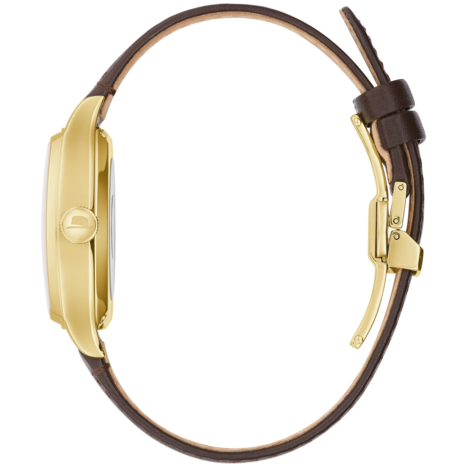 El Bulova 97B198, inspirado en el estilo refinado de Frank Sinatra, presenta una elegante caja tonneau dorada, carátula marrón y un movimiento automático visible a través de su fondo de exhibición. Su estética clásica y su cristal de zafiro lo convierten en una pieza distintiva dentro de la relojería de vestir.