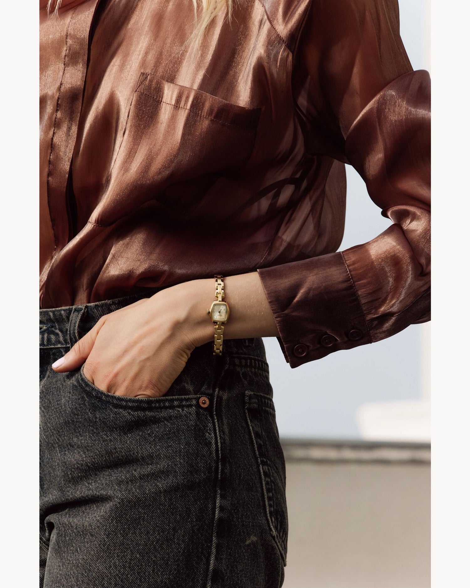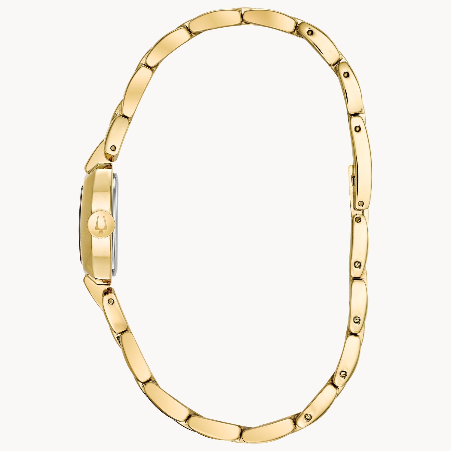 - Descripción: De la Colección Clásica de Bulova, este elegante reloj para mujer combina el brillo del acero inoxidable en tono dorado con una esfera color champán que irradia calidez y distinción. Su cristal mineral curvado aporta un toque vintage y realza los reflejos dorados de la carátula. El brazalete en tono dorado con cierre tipo joya asegura un ajuste cómodo y sofisticado. Impulsado por un movimiento de cuarzo japonés de alta precisión, este modelo encarna la elegancia clásica y la sencillez refinada característica de Bulova.