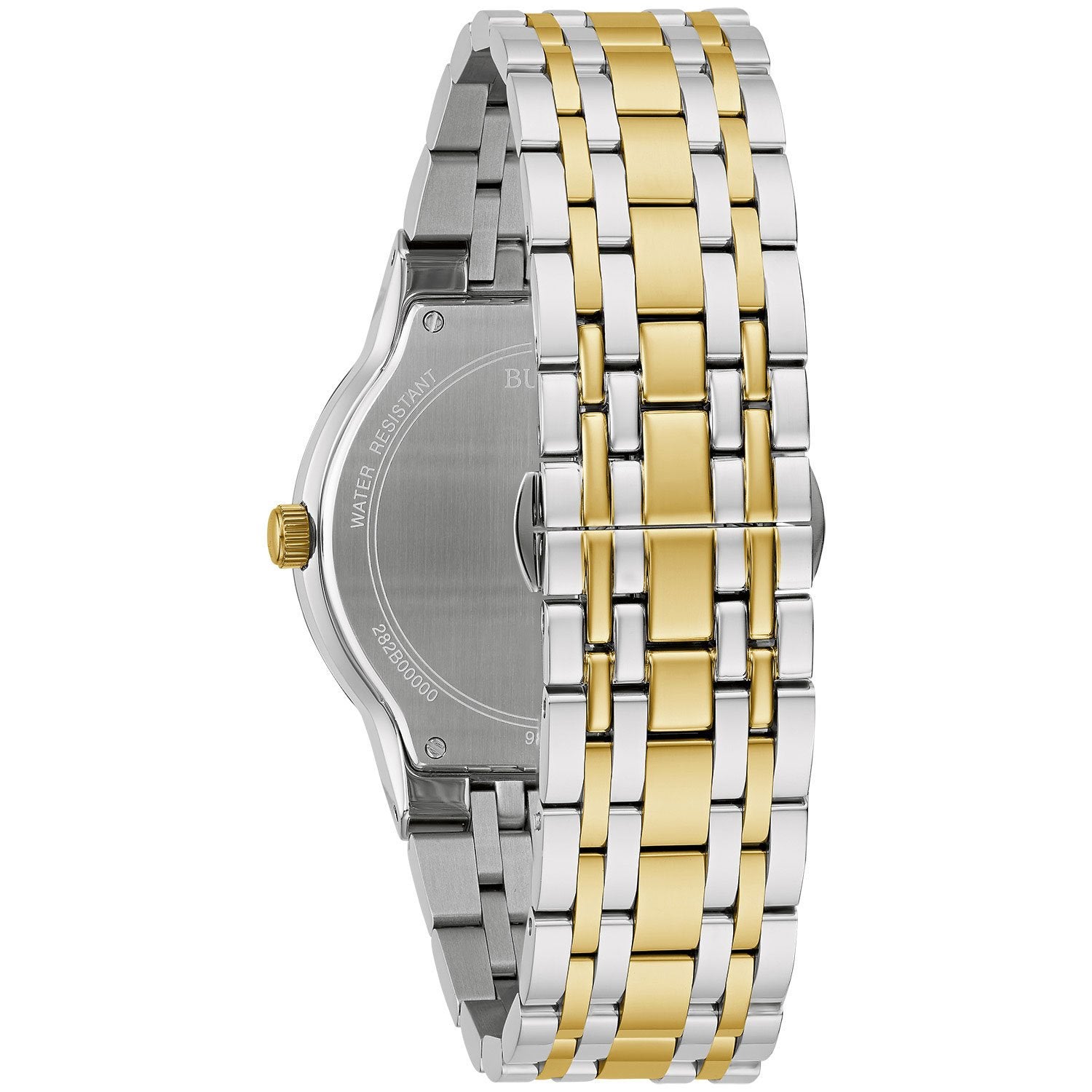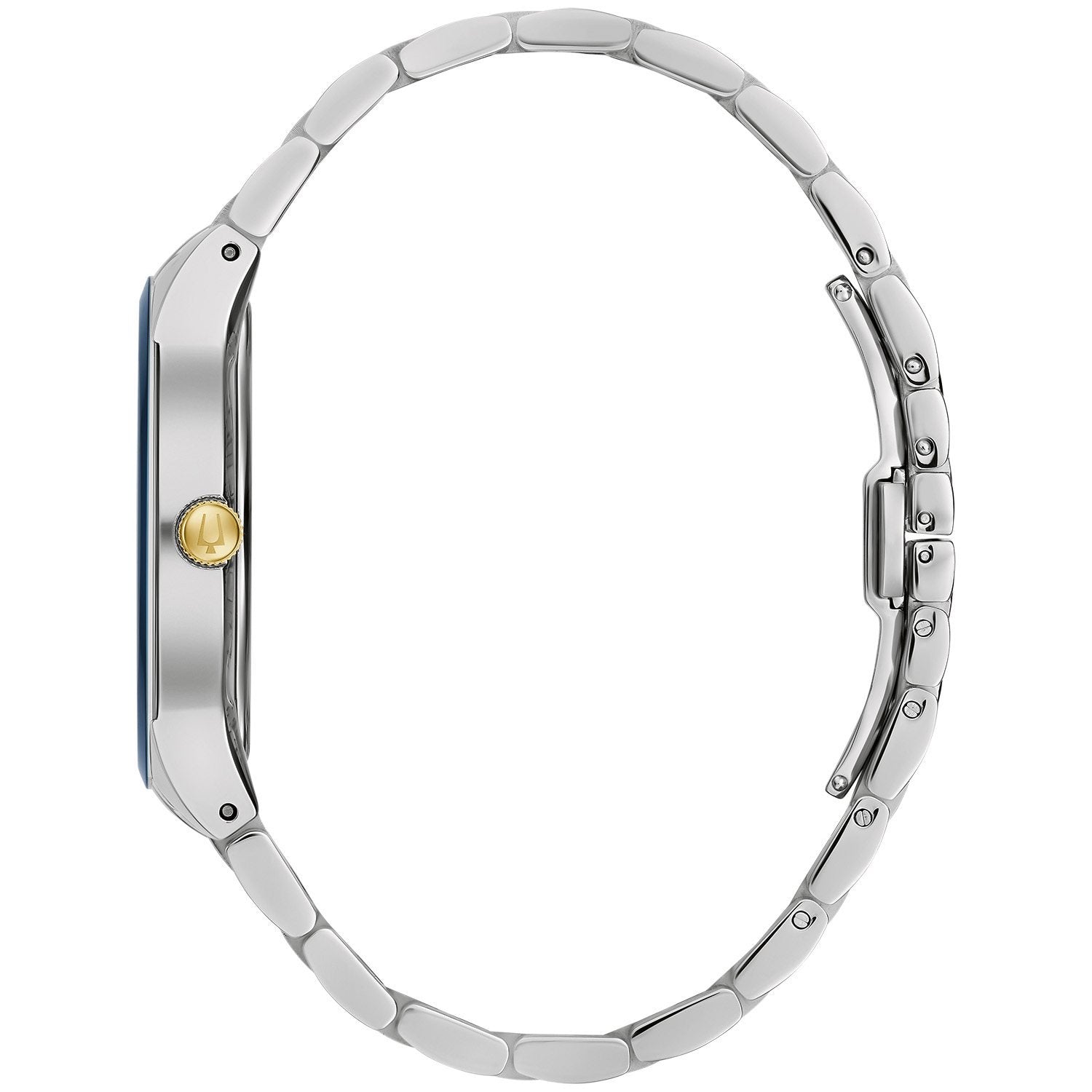 Este Bulova de 40 mm combina un diseño clásico con funciones útiles como día, fecha y formato de 24 horas. Su carátula azul con detalles dorados y brazalete en acero bicolor lo posicionan como una pieza elegante y versátil para uso diario o de vestir.